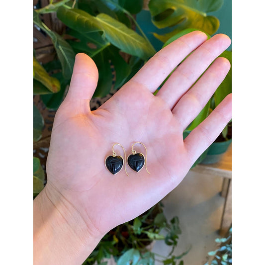 Solid 14k Black Onyx Carved Scarab Heart Dangle Earrings