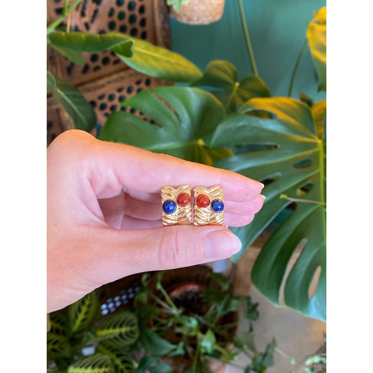 Solid 14k Yellow Gold Carnelian Blue Lapis Drop Earrings