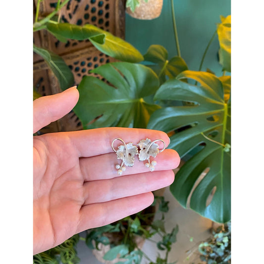 Vintage Solid 14k White Gold Pearl Grape Leaves Stud Earrings