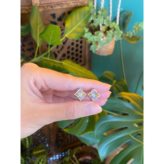Solid 14k White Gold Diamond Colored Sapphire Square Stud Earrings