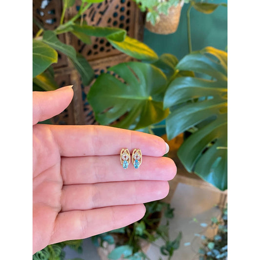 Vintage Solid 14k Yellow Gold Turquoise Scalloped Stud Earrings