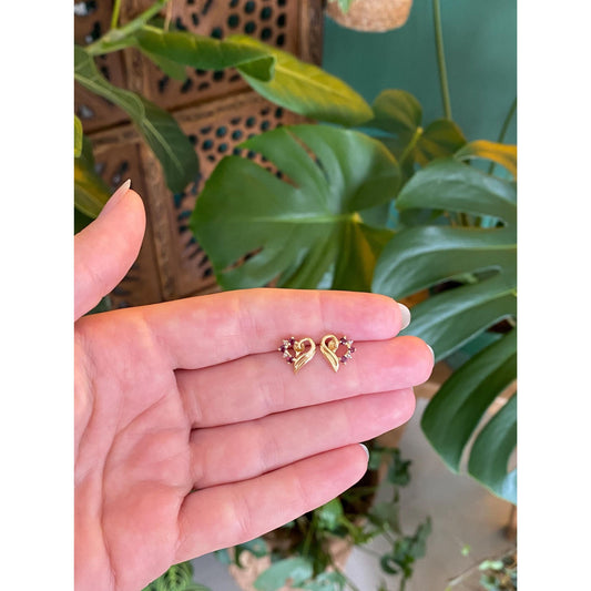 Vintage Solid 14k Yellow Gold Diamond Ruby Heart Stud Earrings