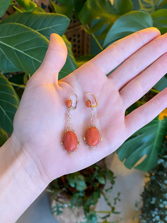 Vintage Solid 14k Yellow Gold Coral Filigree Dangle Earrings