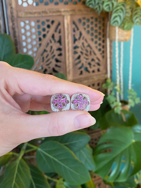 Vintage Solid 18k White Gold Diamond Halo Pink Sapphire Stud Earrings