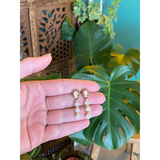 Vintage Solid 14k Yellow Gold Cameo Pearl Drop Stud Earrings