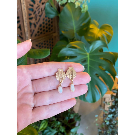 Vintage Solid 14k Rosey Gold Pearl Abstract Dangle Stud Earrings