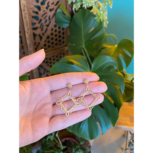Vintage Solid 14k Yellow Gold Open Work Picture Frame Dangle Stud Earrings