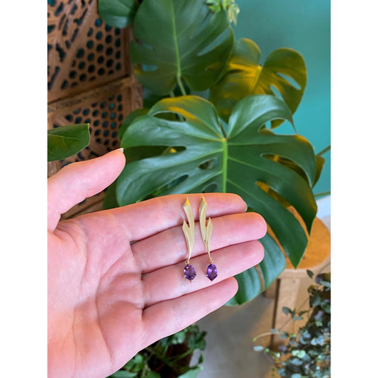Vintage Solid 14k Yellow Gold Amethyst Dangle Stud Earrings