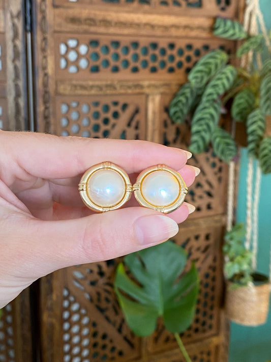 Vintage Solid 14k Yellow Gold Large Pearl Stud Earrings