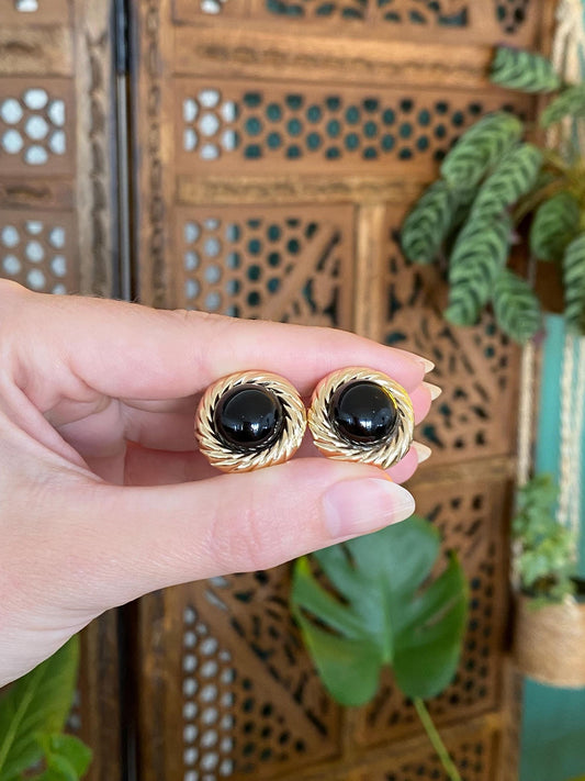 Vintage Solid 14k Yellow Gold Black Onyx Twist Border Stud Earrings