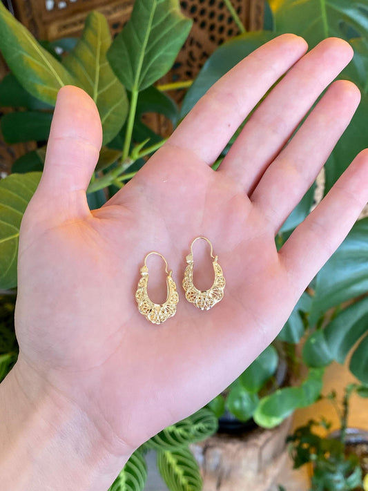 Vintage Solid 14k Yellow Gold Filigree Open Work Hoop Earrings