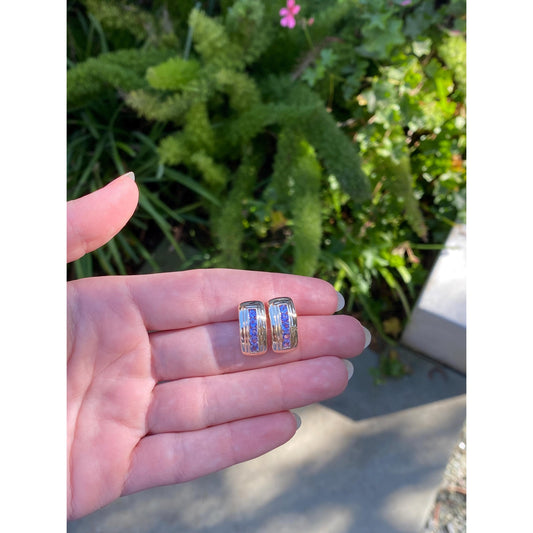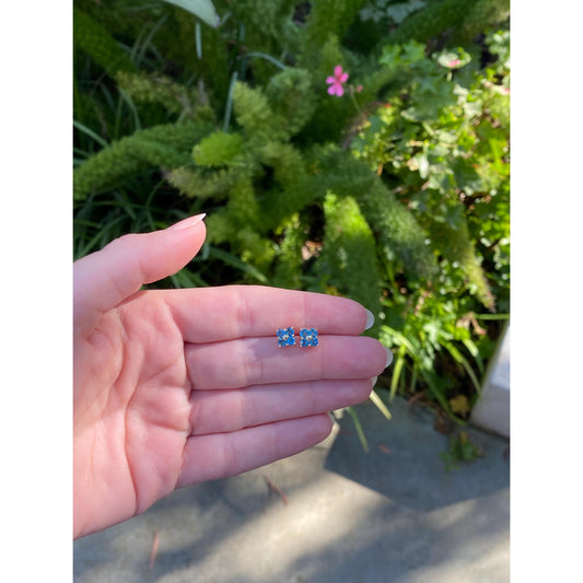 Vintage Solid 14k Yellow Gold Bright Blue Aquamarine Grid Stud Earrings