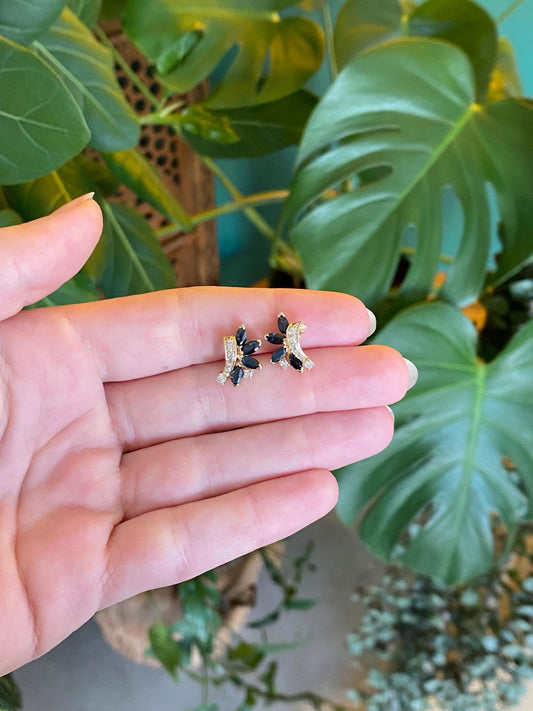 Vintage Solid 14k Yellow Gold Blue Spinel Diamond Stud Earrings