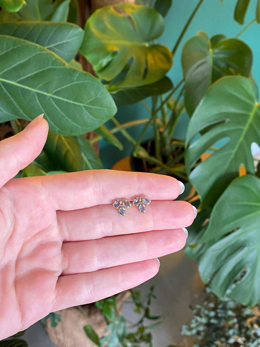 Vintage Solid 14k Yellow Gold Blue Sapphire Flower Stud Earrings