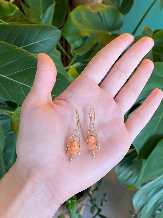 Vintage Solid 9k Yellow Gold Diamond Coral Cameo Dangle Earrings