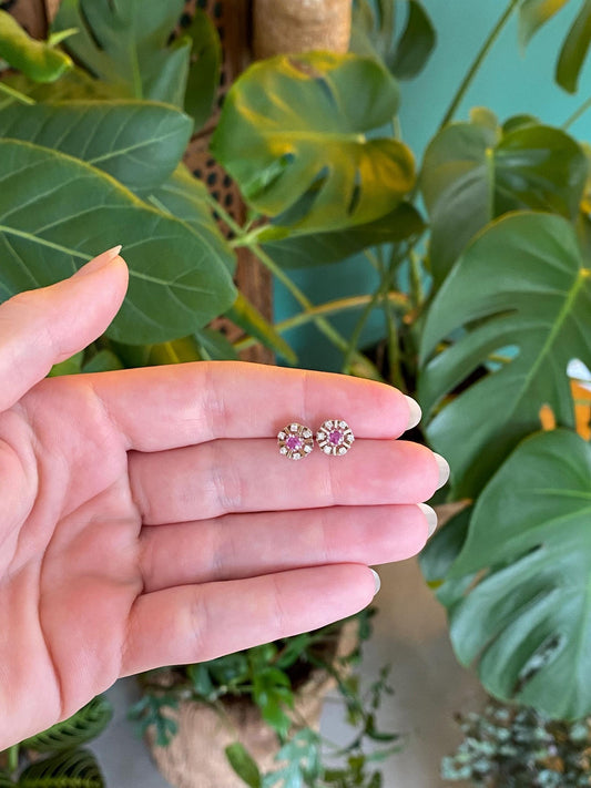 Vintage Solid 14k White Gold Pink & Clear Spinel Halo Stud Earrings
