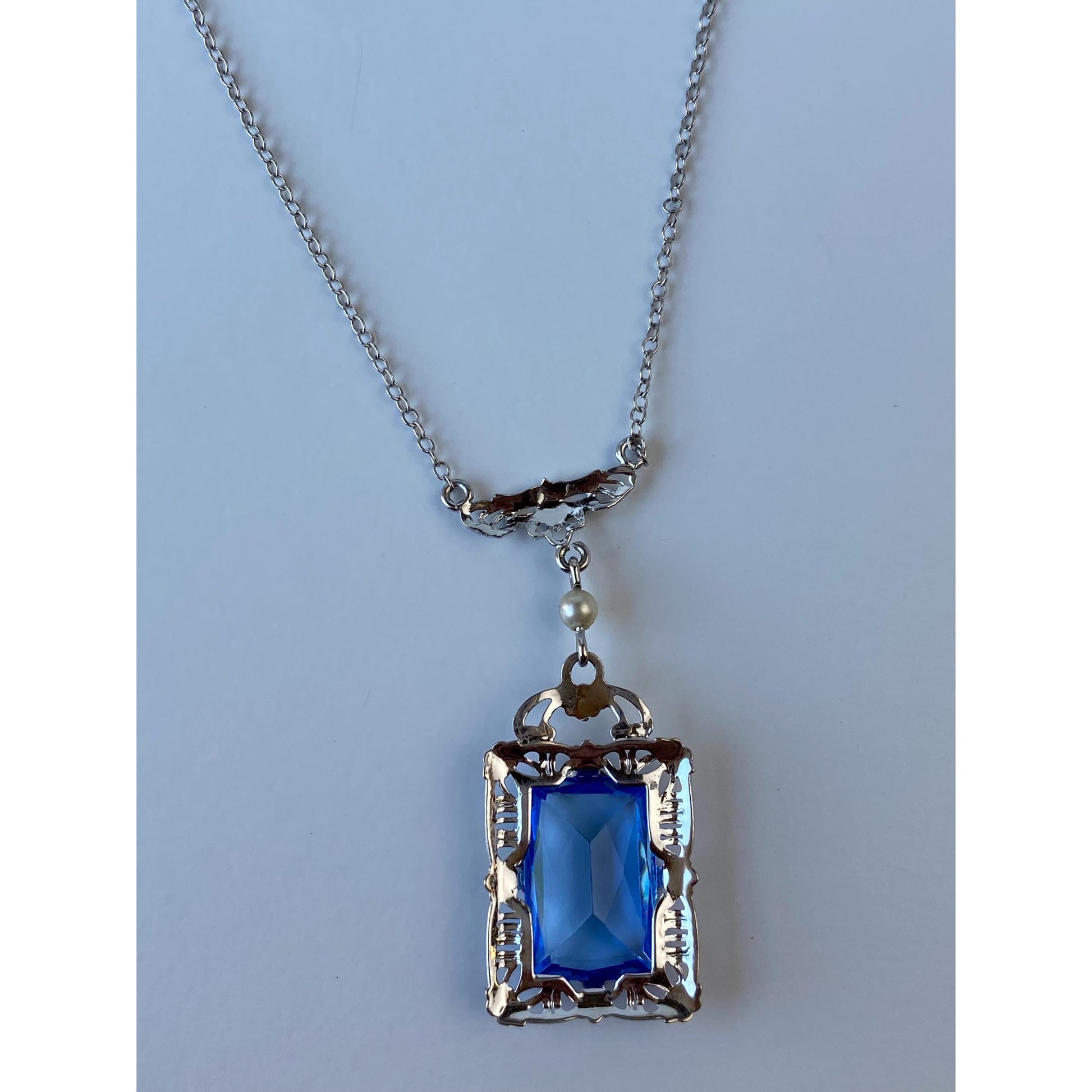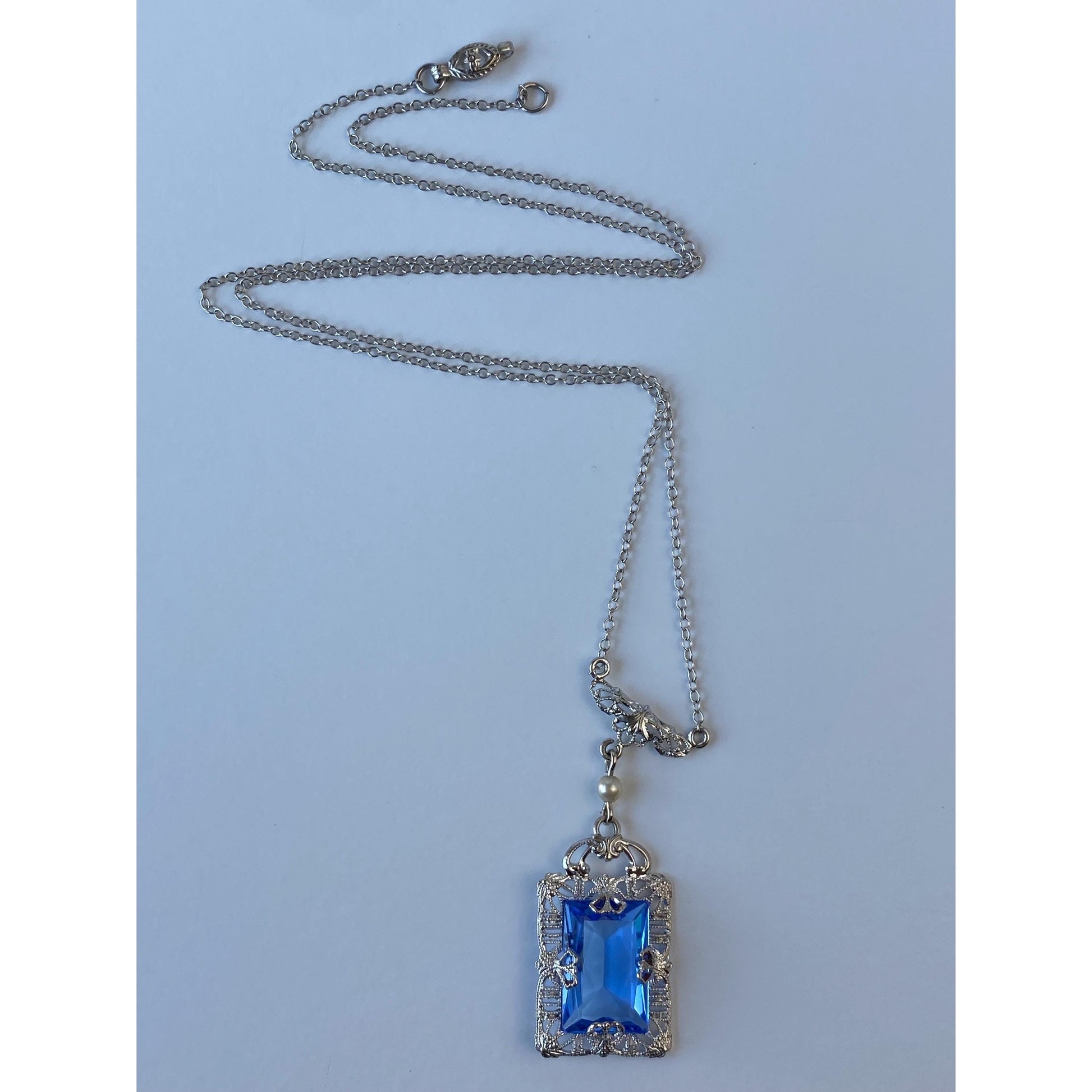 Solid 10k White Gold Blue Cubic Zirconia Pearl Art Deco Necklace - 16.25 inches