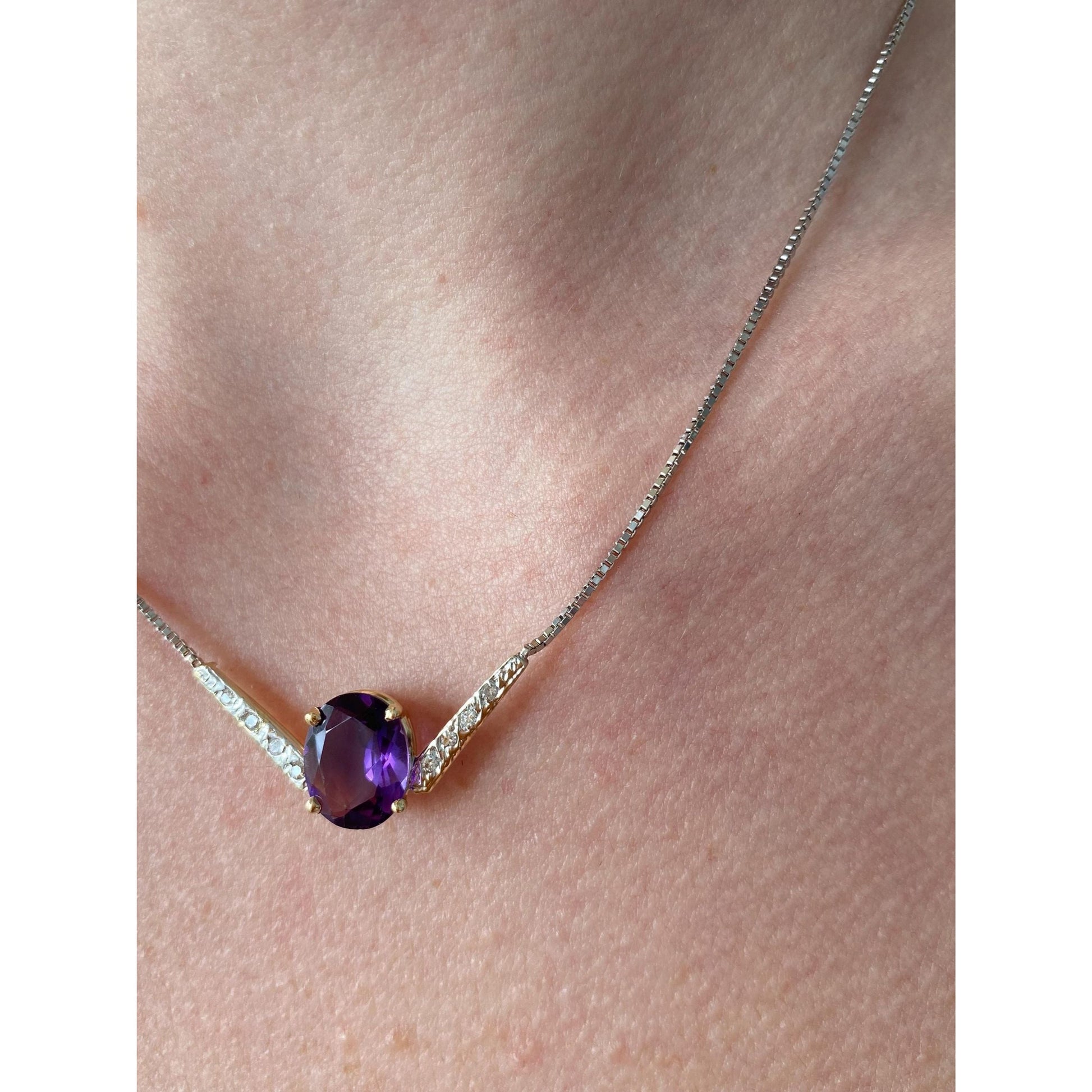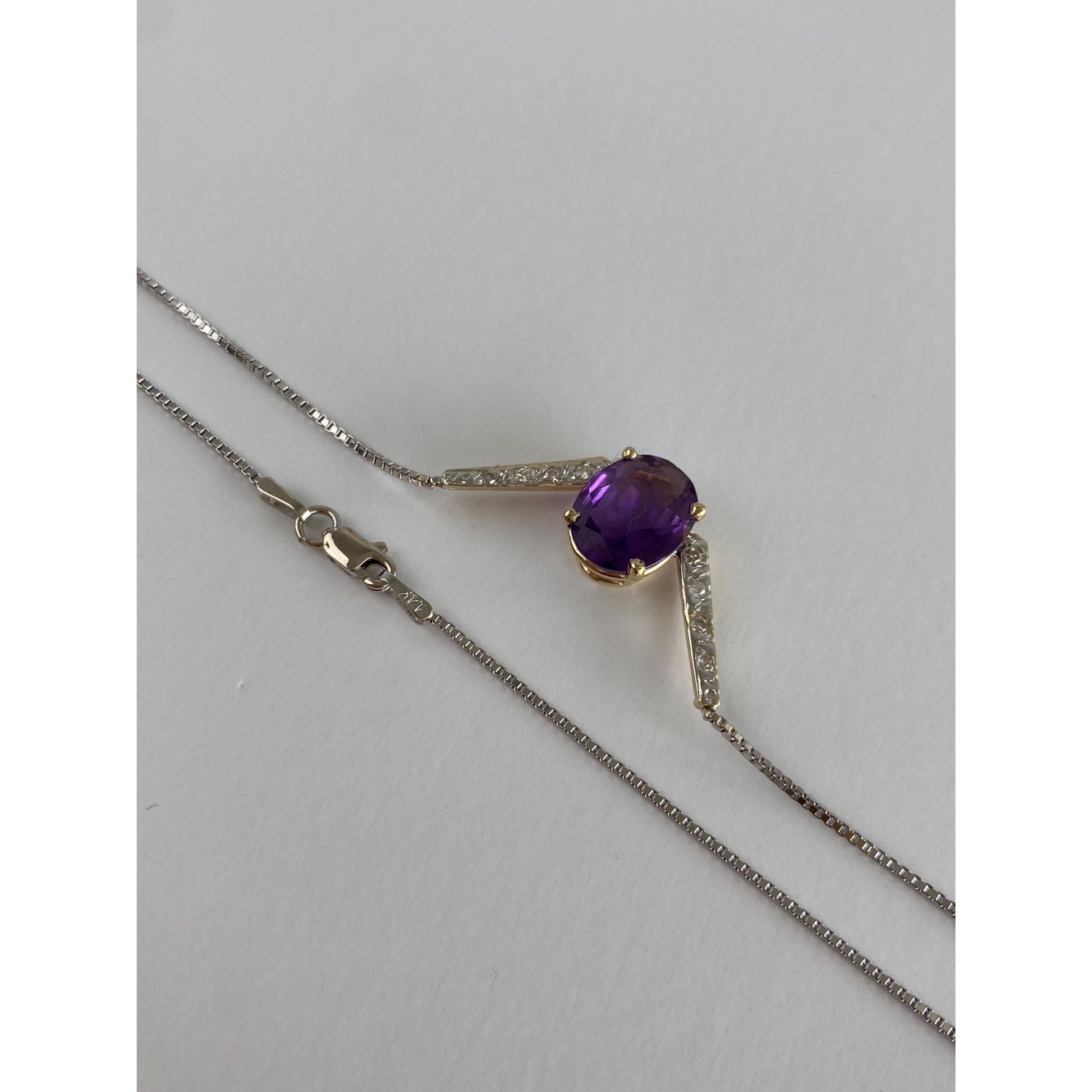 Solid 14k White & Yellow Gold Diamond Amethyst Box Chain Necklace - 16.25 inches