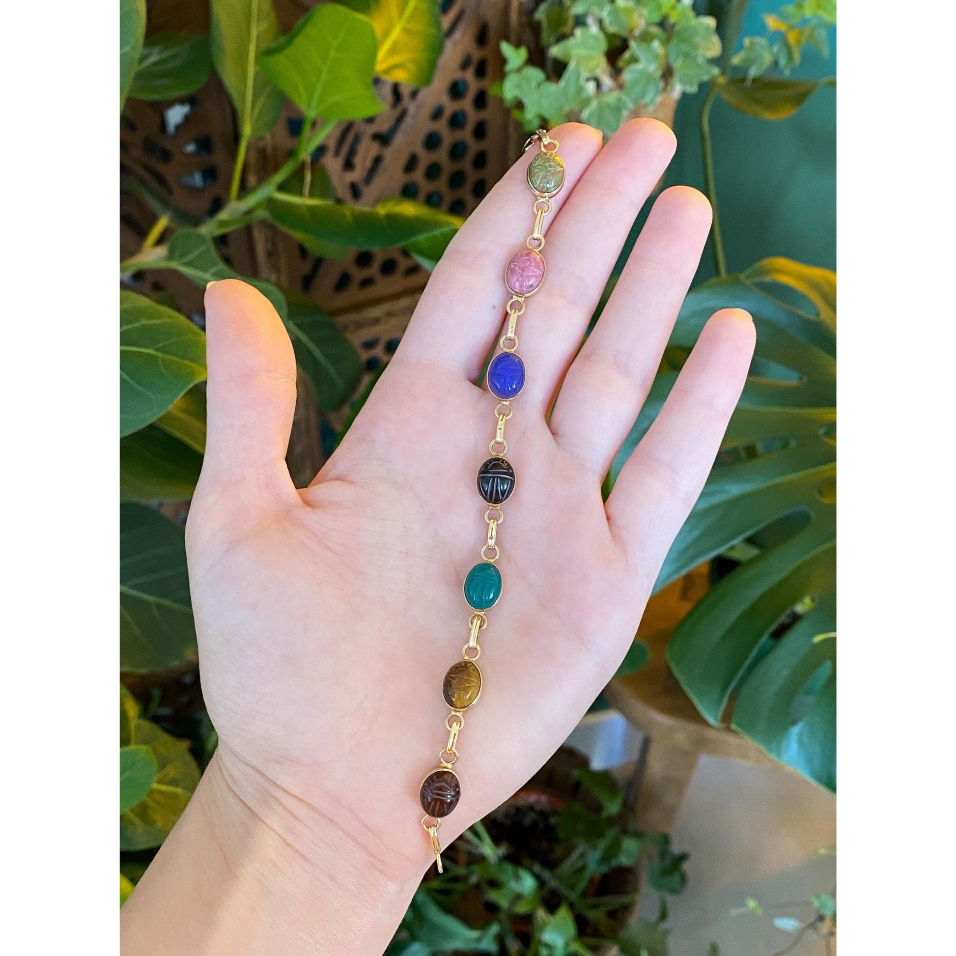 Solid 14k Yellow Gold Carved Scarab Link Bracelet - 7 inches