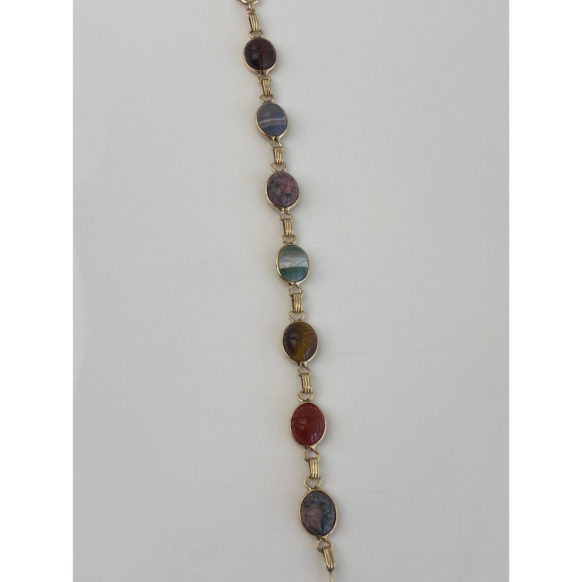 Solid 14k Yellow Gold Carved Tigers Eye Carnelian Agate Rhodolite Scarab Link Bracelet - 7.75 inches