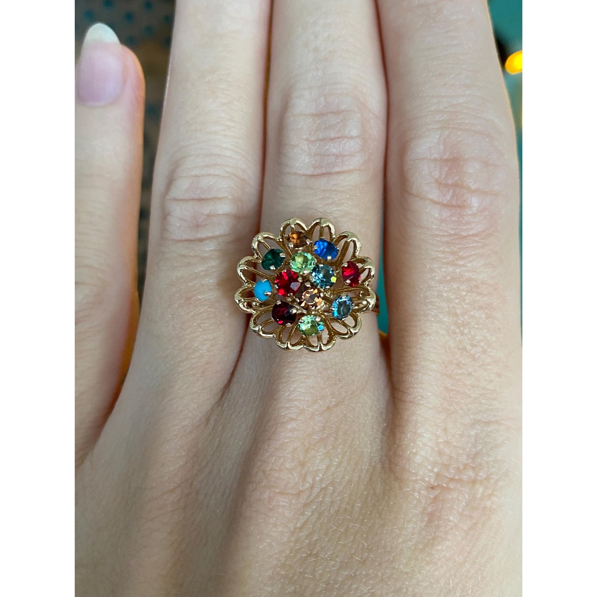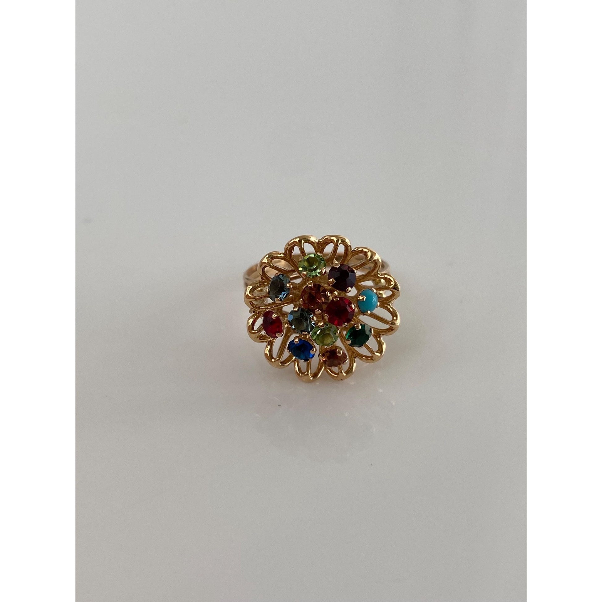 Solid 14k Yellow Gold Colored Cubic Zirconia & Turquoise Flower Ring - Size 6.5