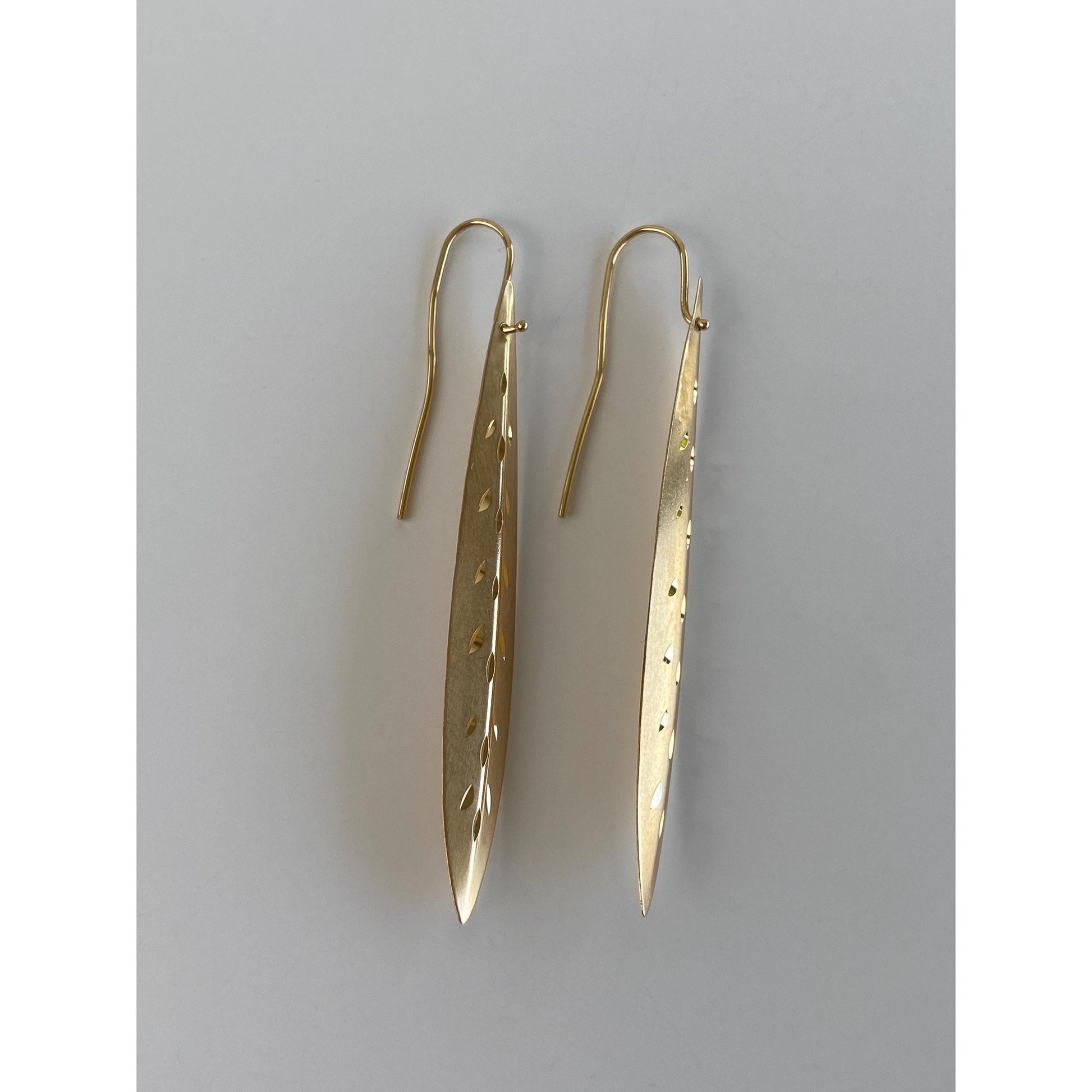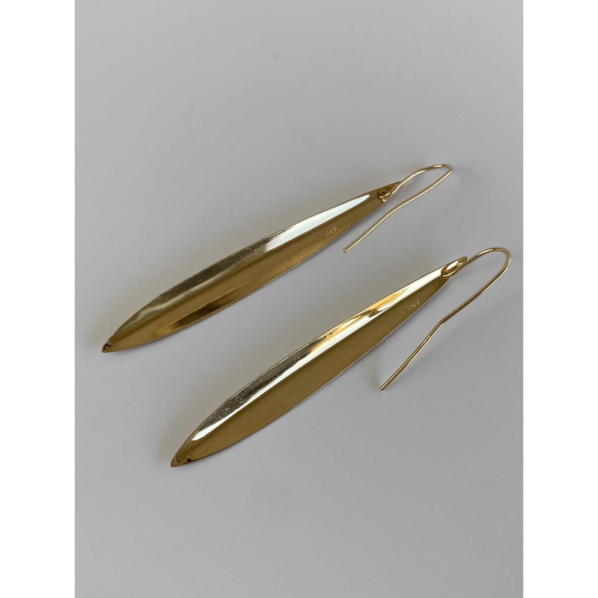 Solid 14k Yellow Gold Diamond Cut Long Leaf Dangle Earrings