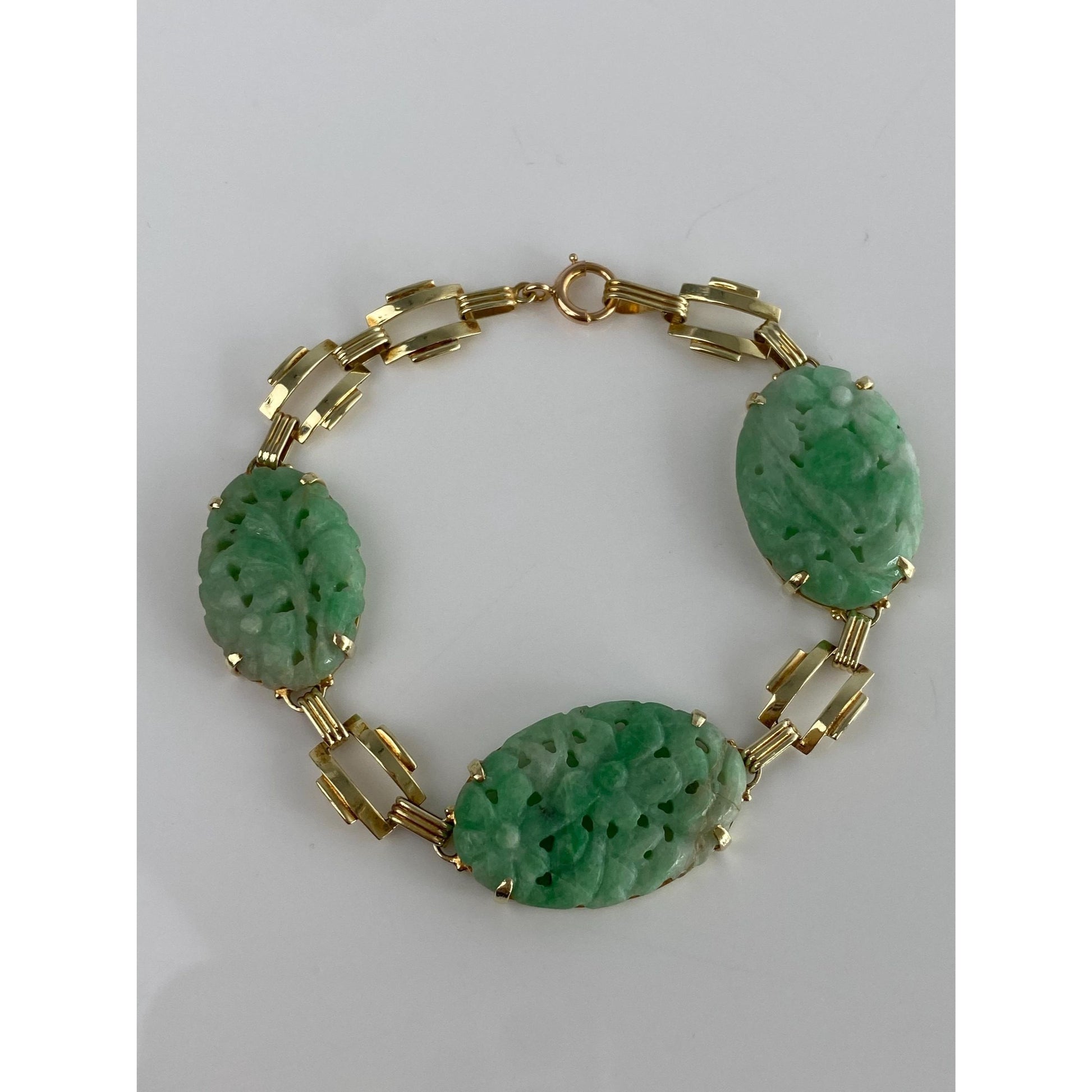 Solid 14k Yellow Gold Floral Carved Jade Link Bracelet - 7 Inches