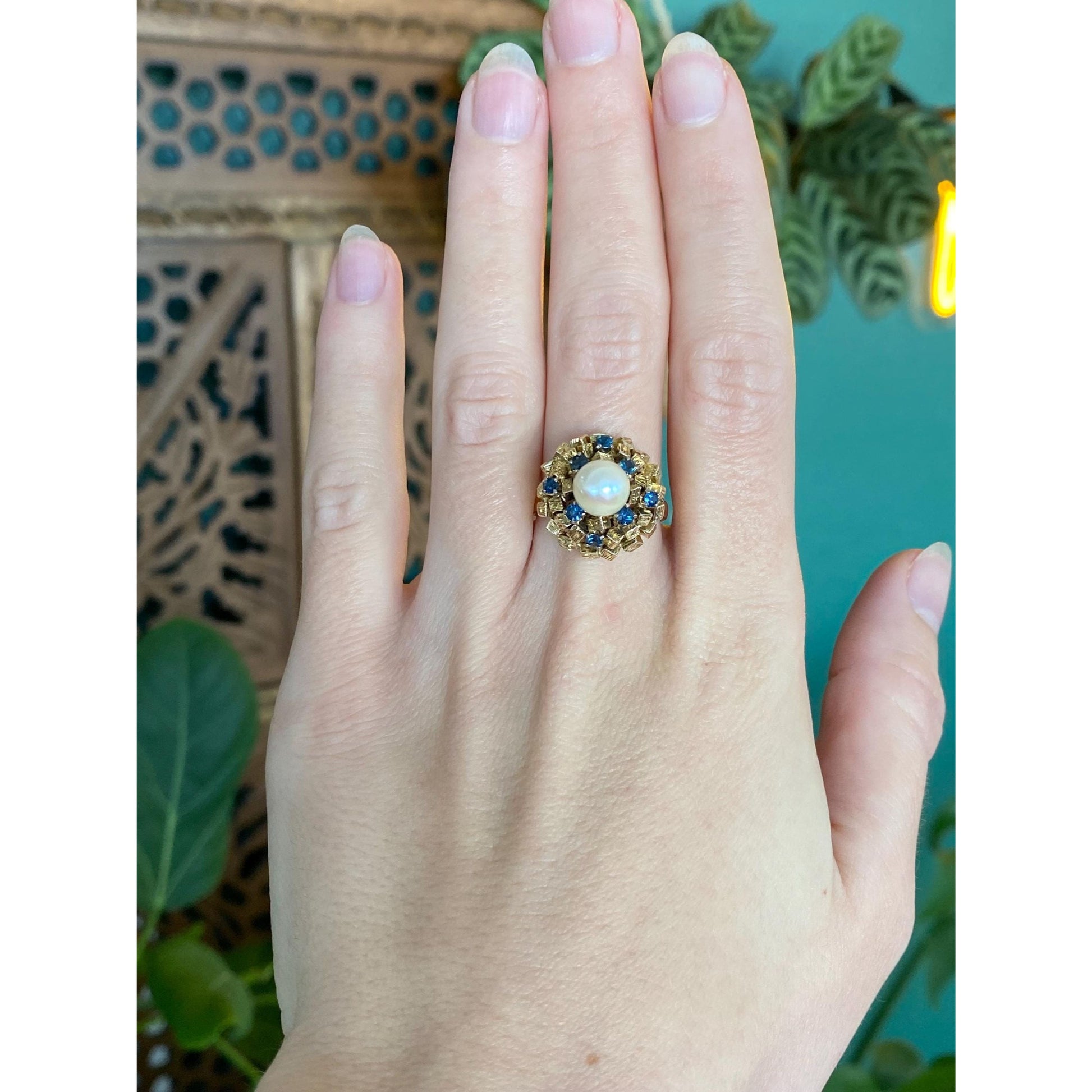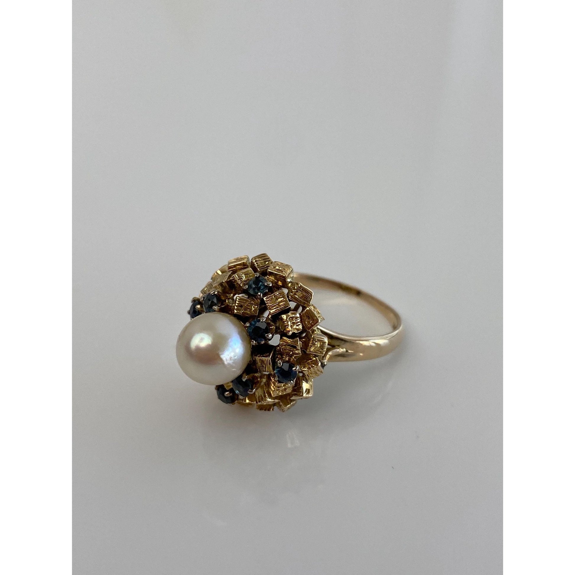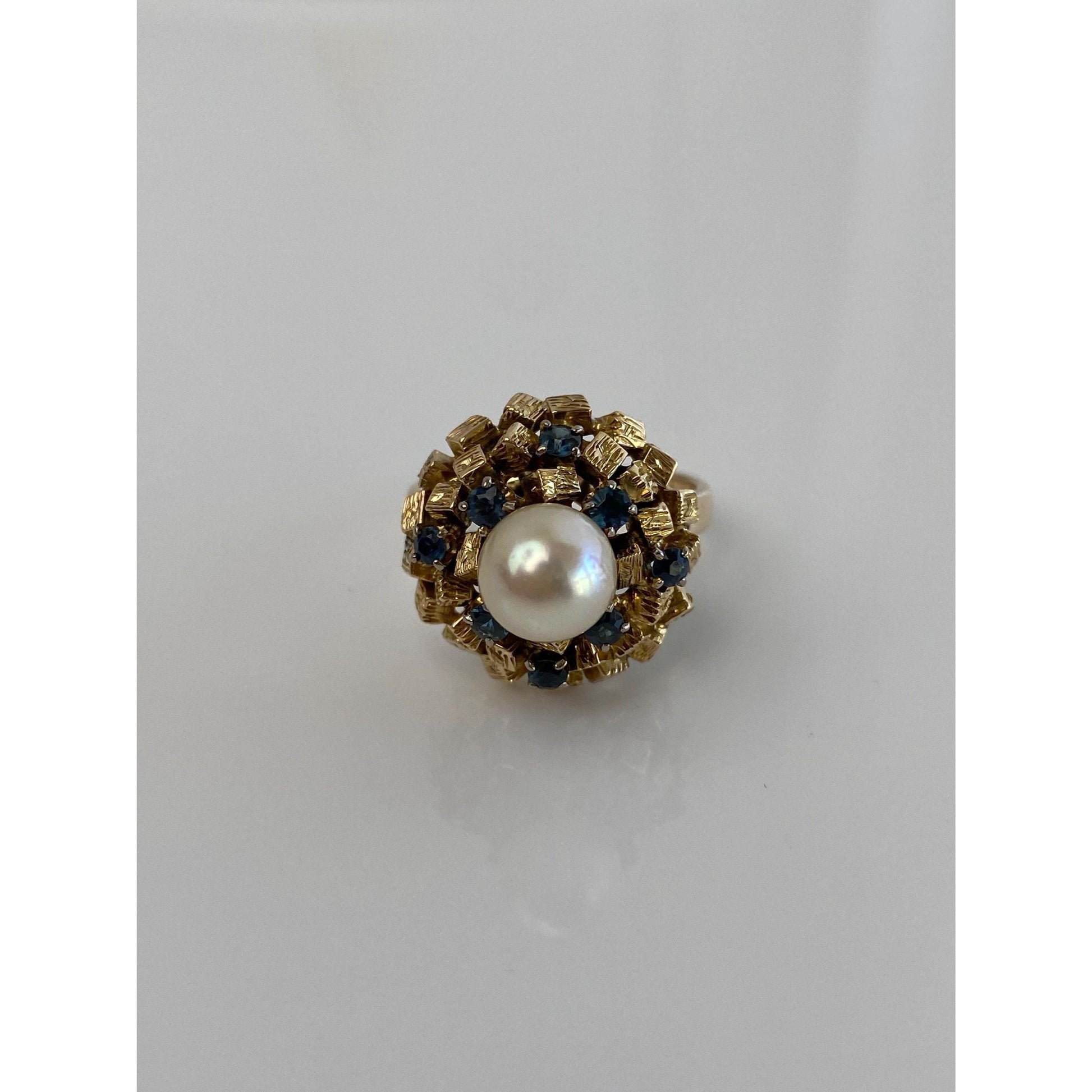 Solid 14k Yellow Gold Pearl Blue Sapphire Cocktail Ring - Size 7.5