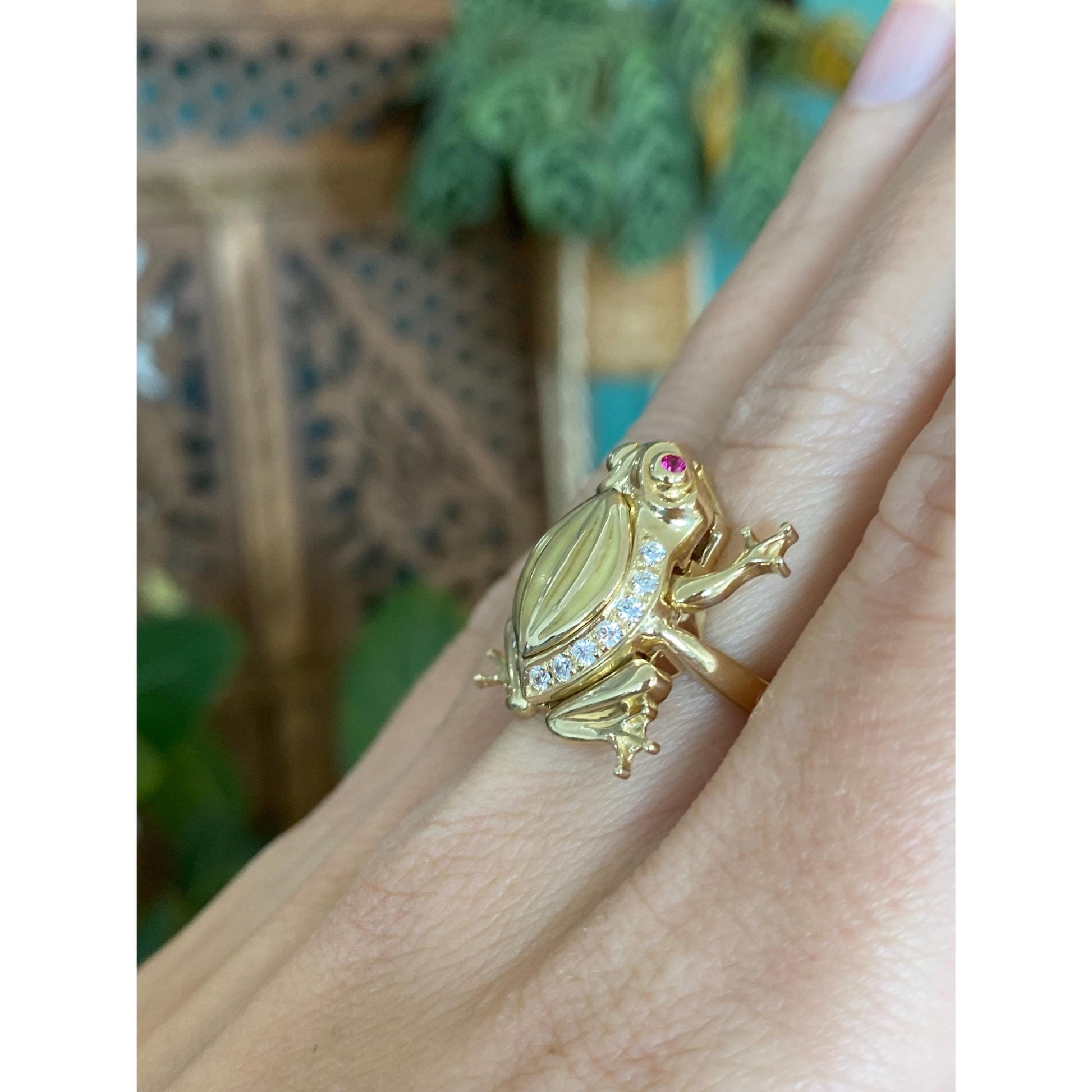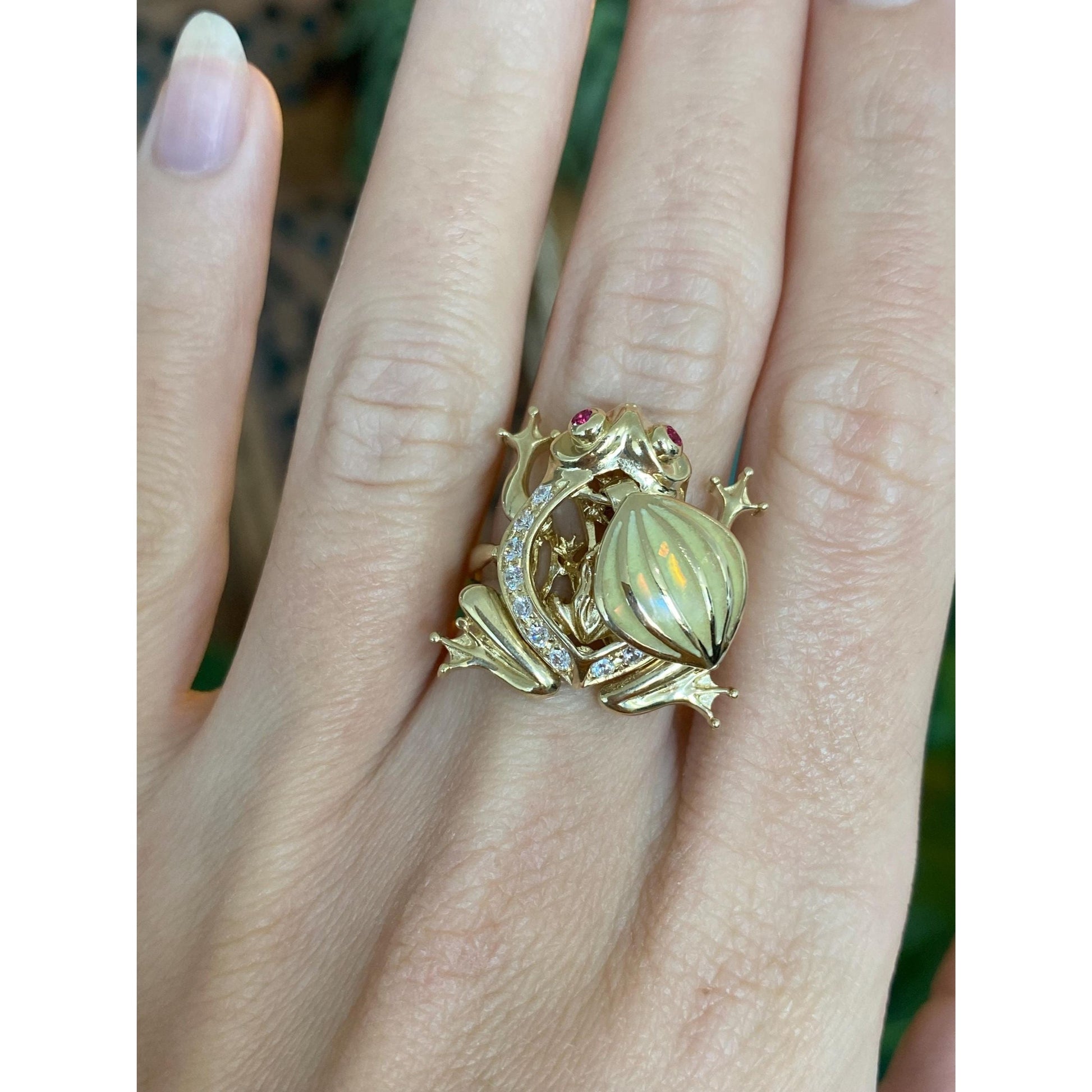 Solid 14k Yellow Gold Pink Sapphire Clear Cubic Zirconia Articulated Pregnant Frog Ring - Size 5.75
