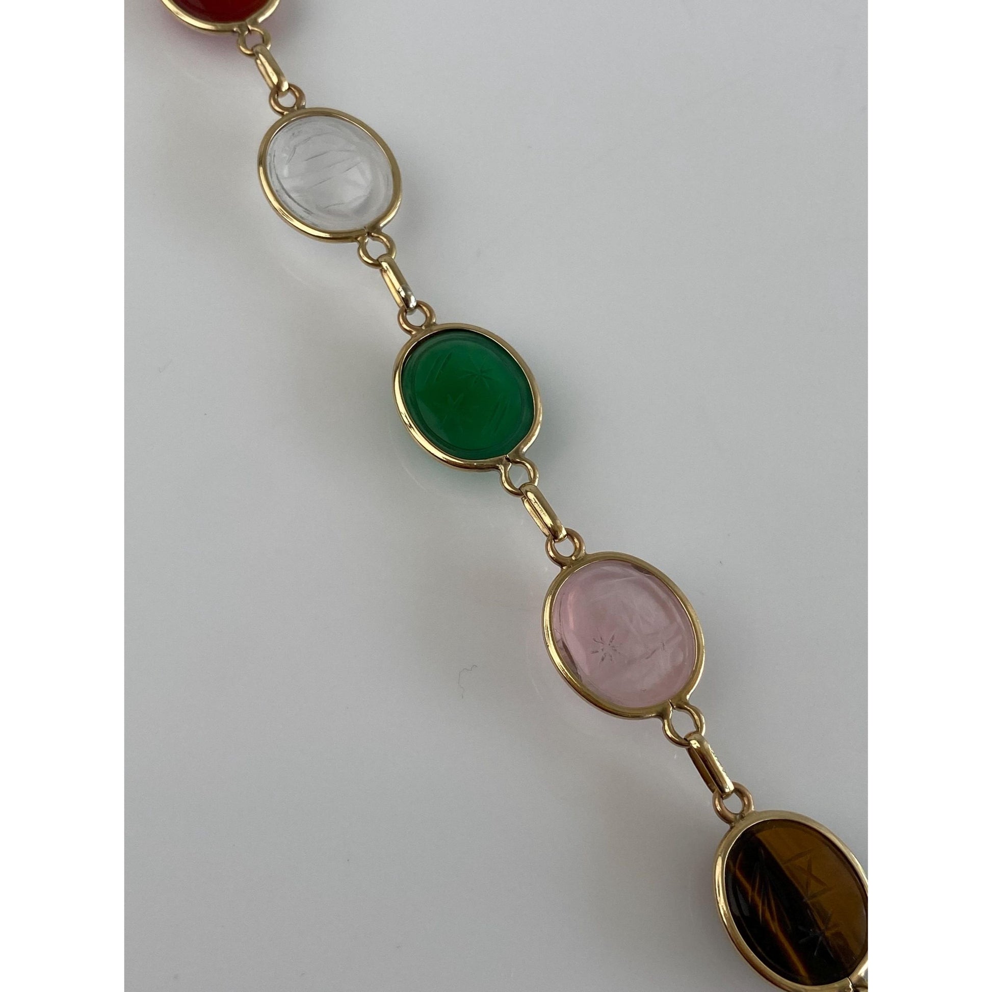 Solid 14k Yellow Gold Tigers Eye Rose & Clear Quartz Agate Green Chalcedony Carnelian Scarab Bracelet - 6.75 inches