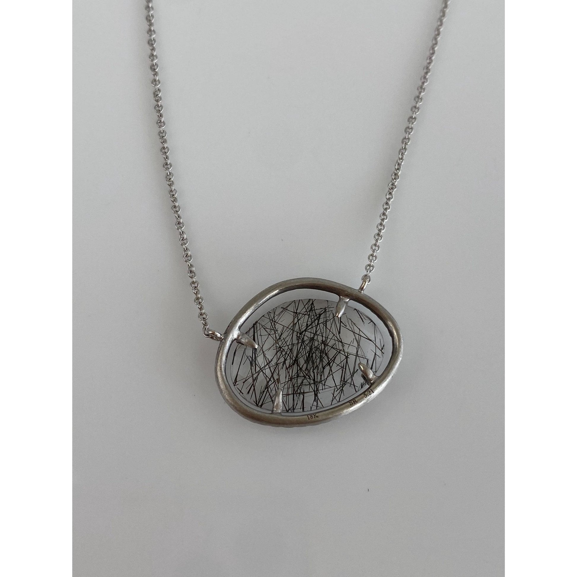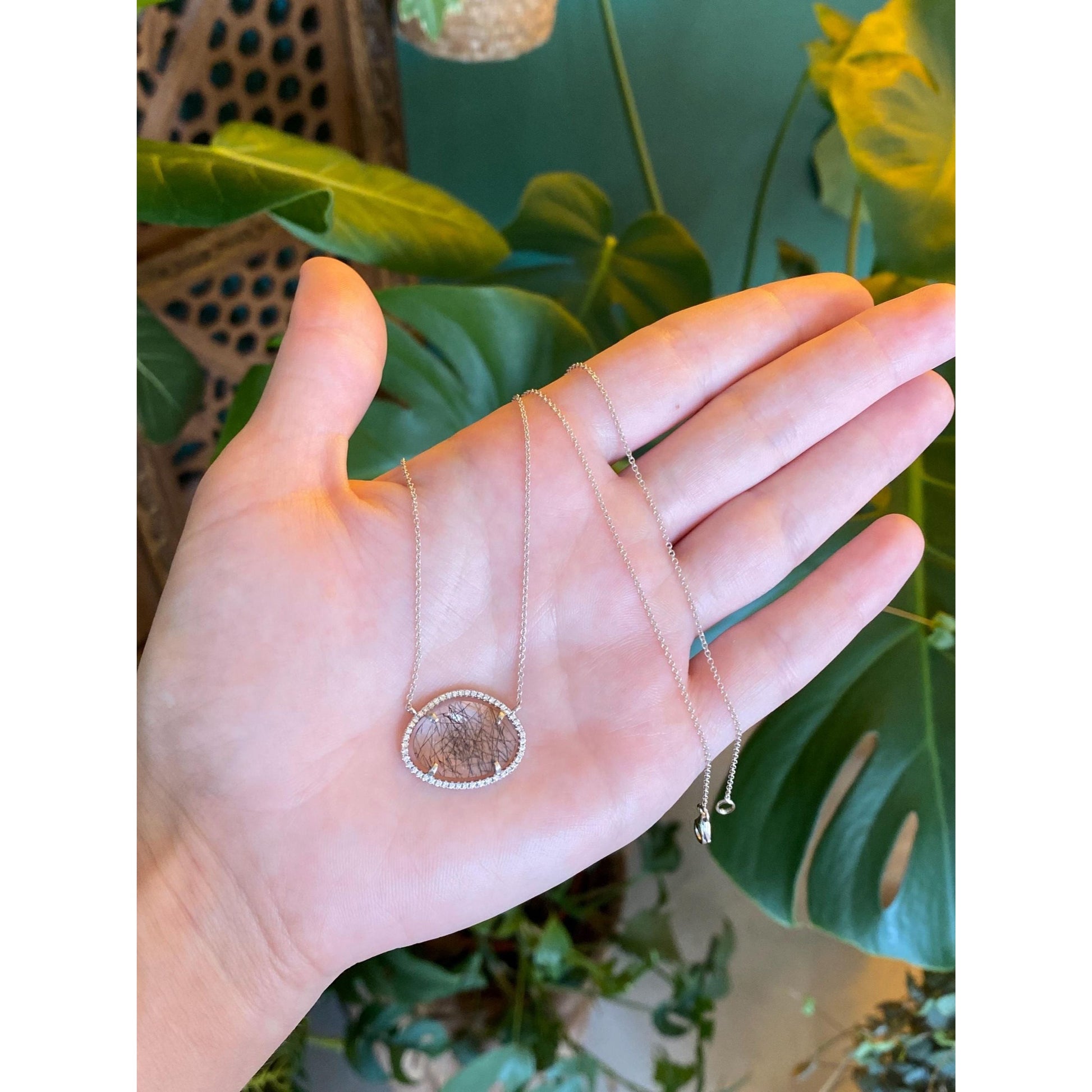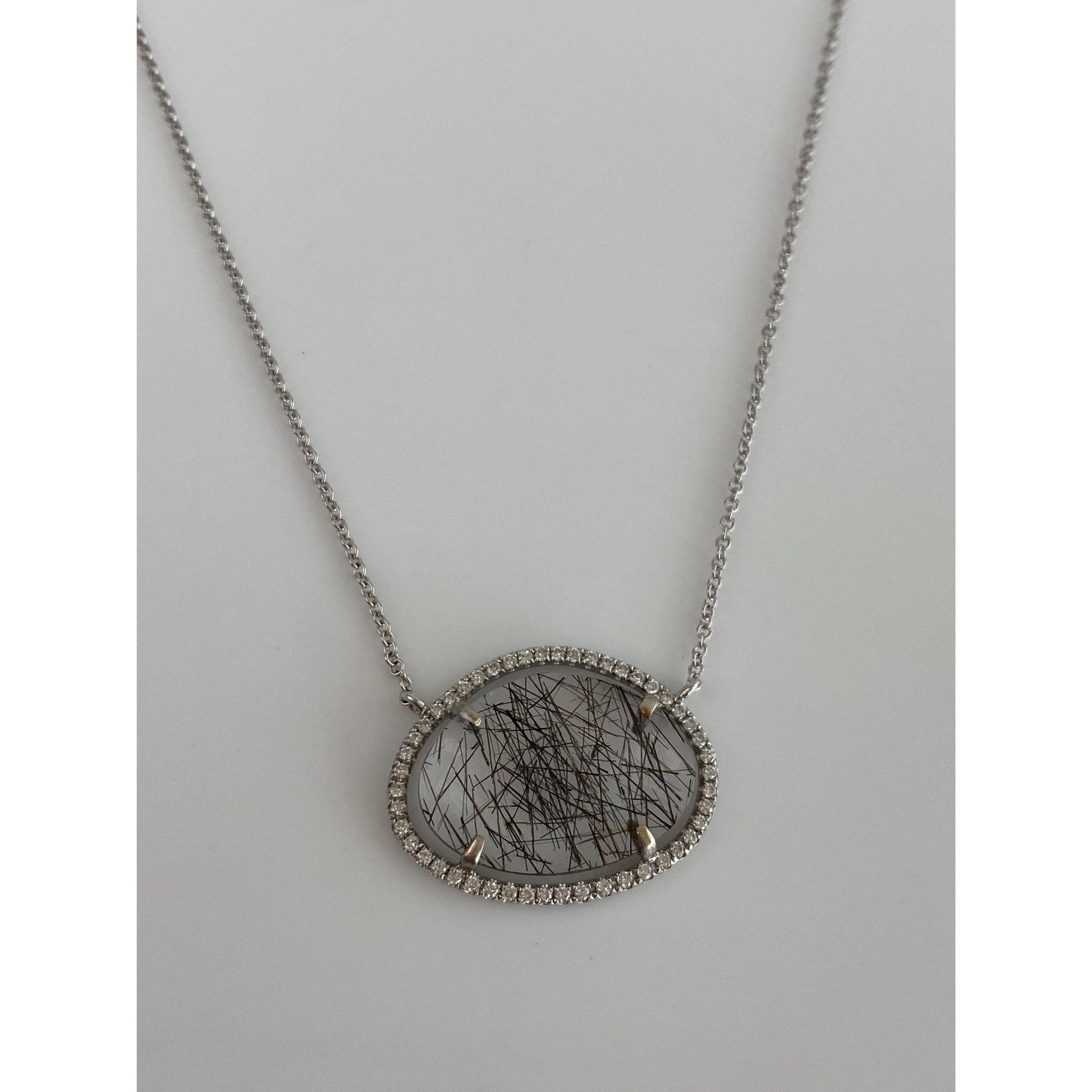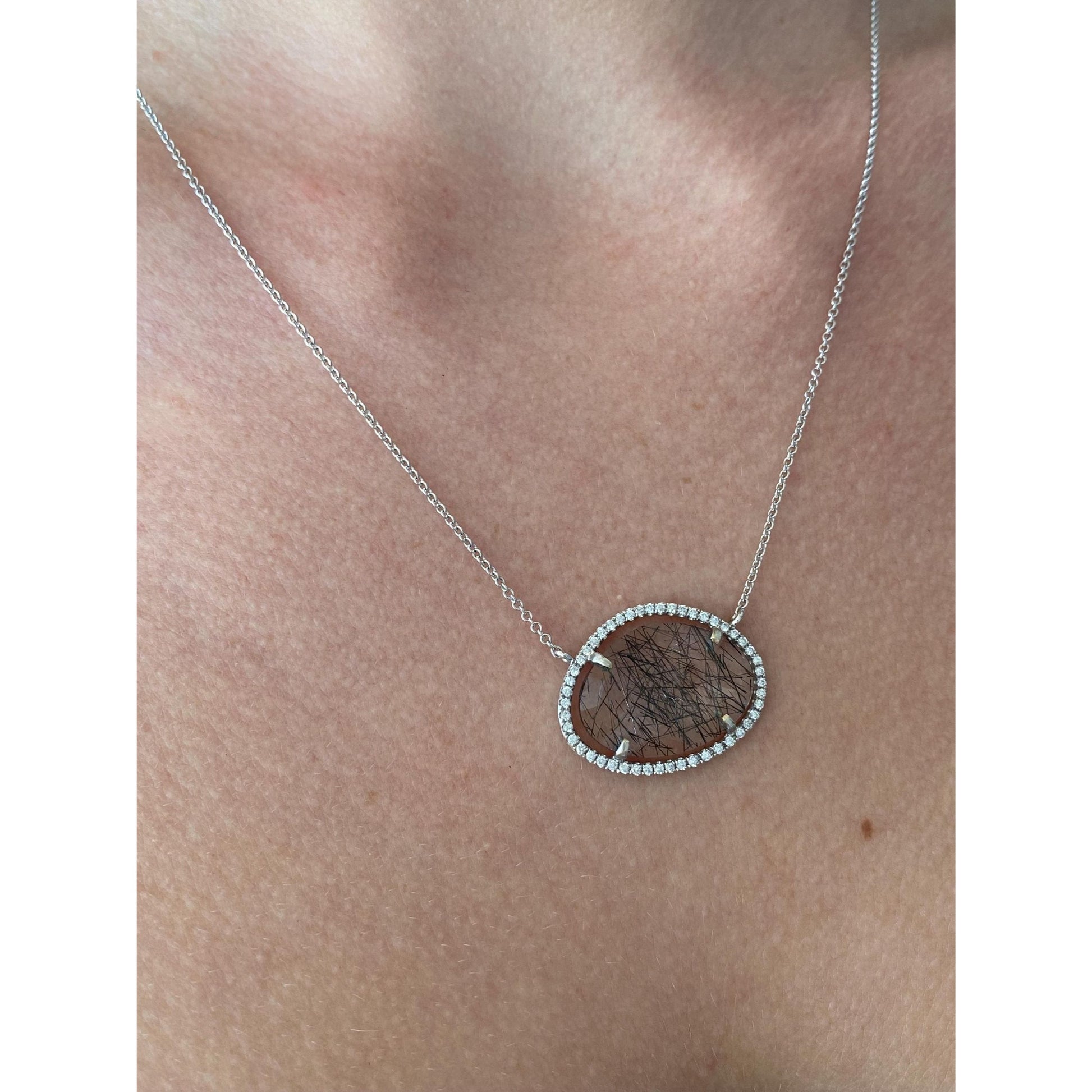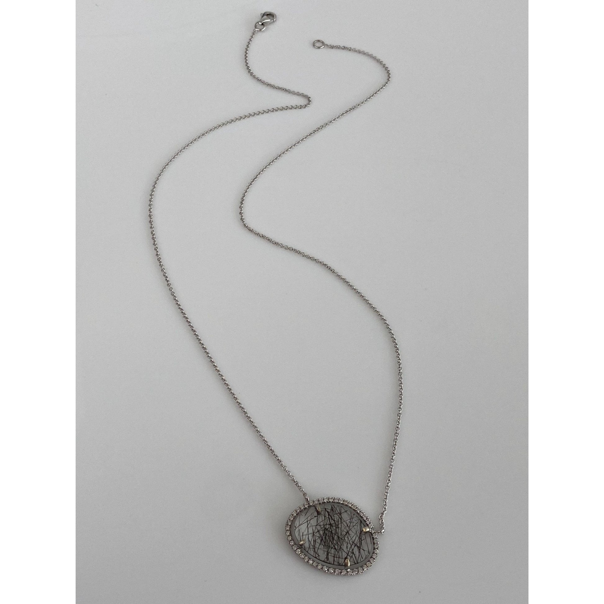 Solid 18k White Gold Diamond Halo Black Rutilated Quartz Tight Rolo Chain Necklace - 18 inches