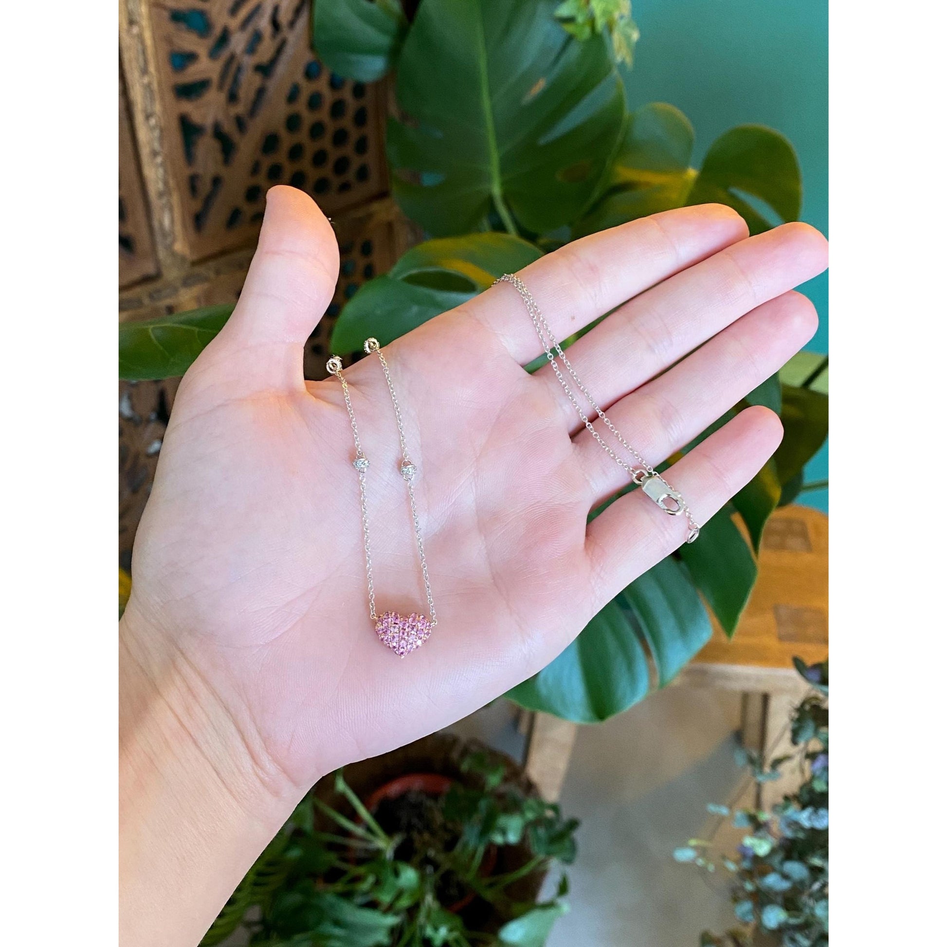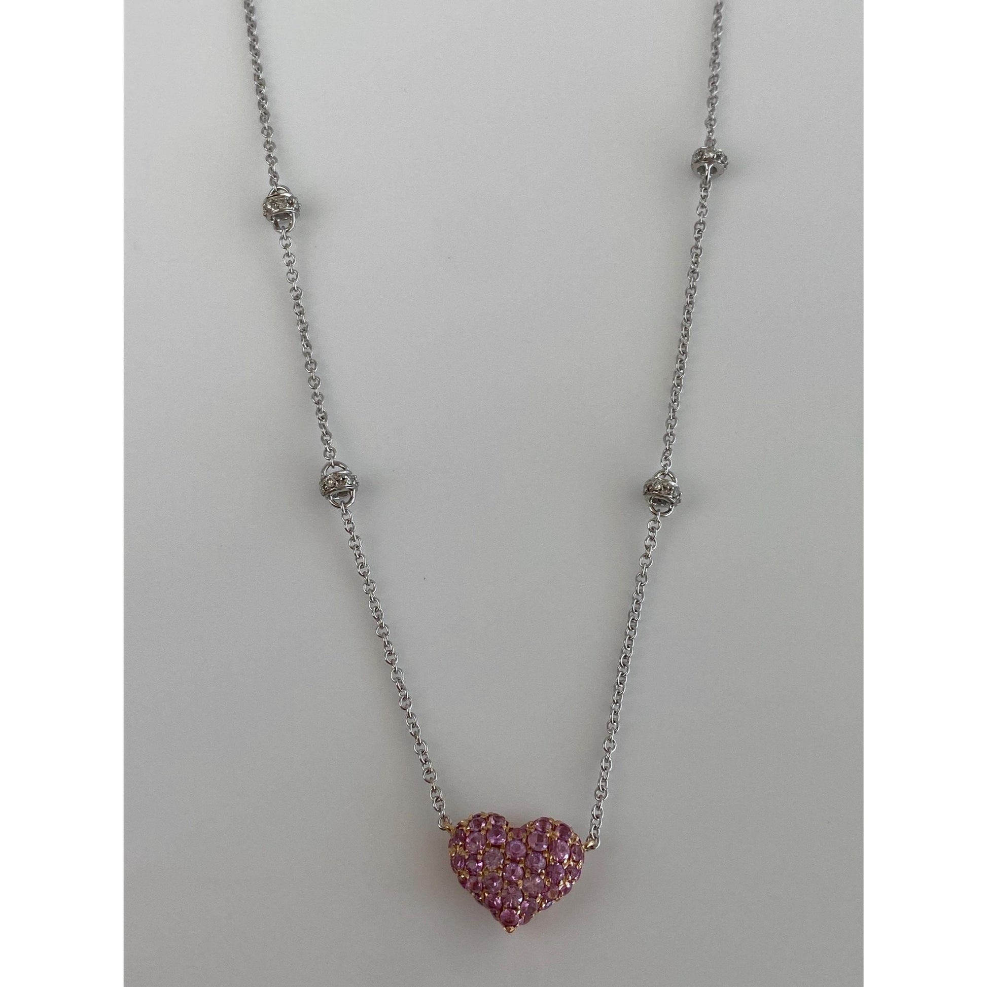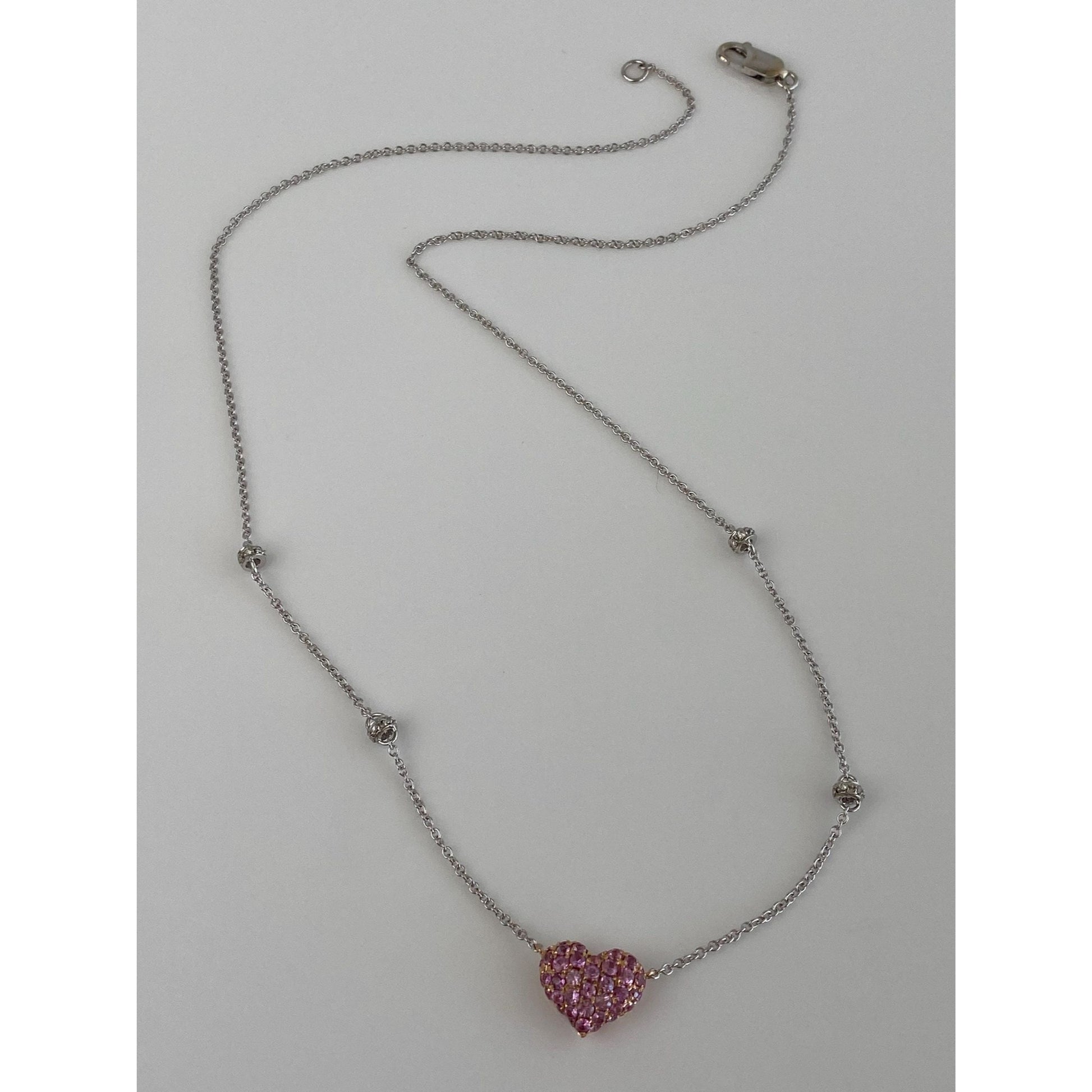 Solid 18k White & Rose Gold Pink and Clear Sapphire Heart Cable Link Chain Necklace - 17.25 inches