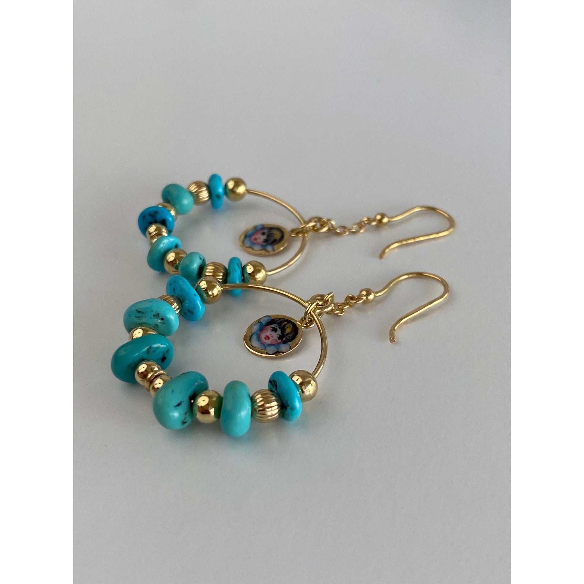 Solid 18k Yellow Gold Enamel Turquoise Hoop Dangle Earrings