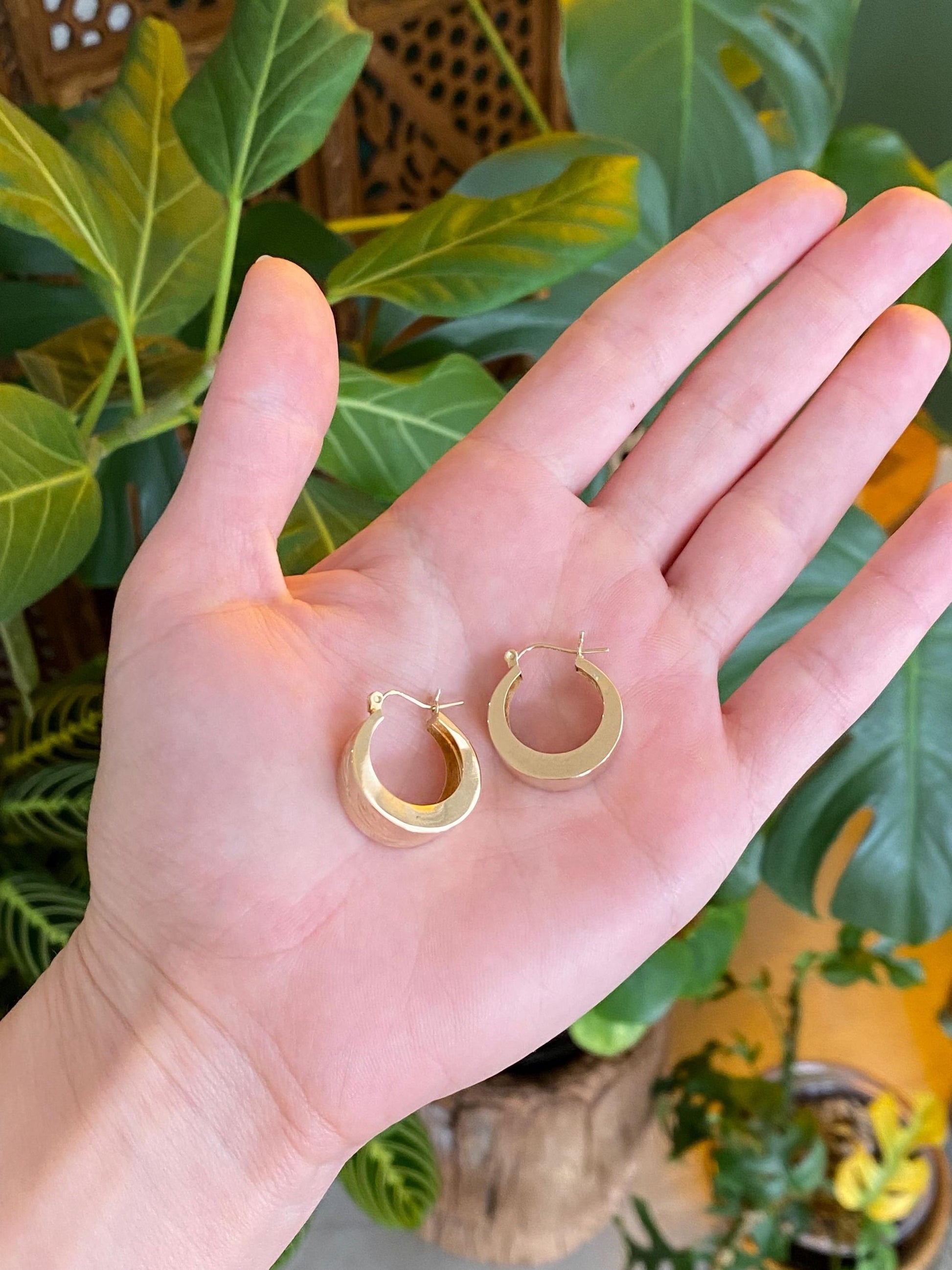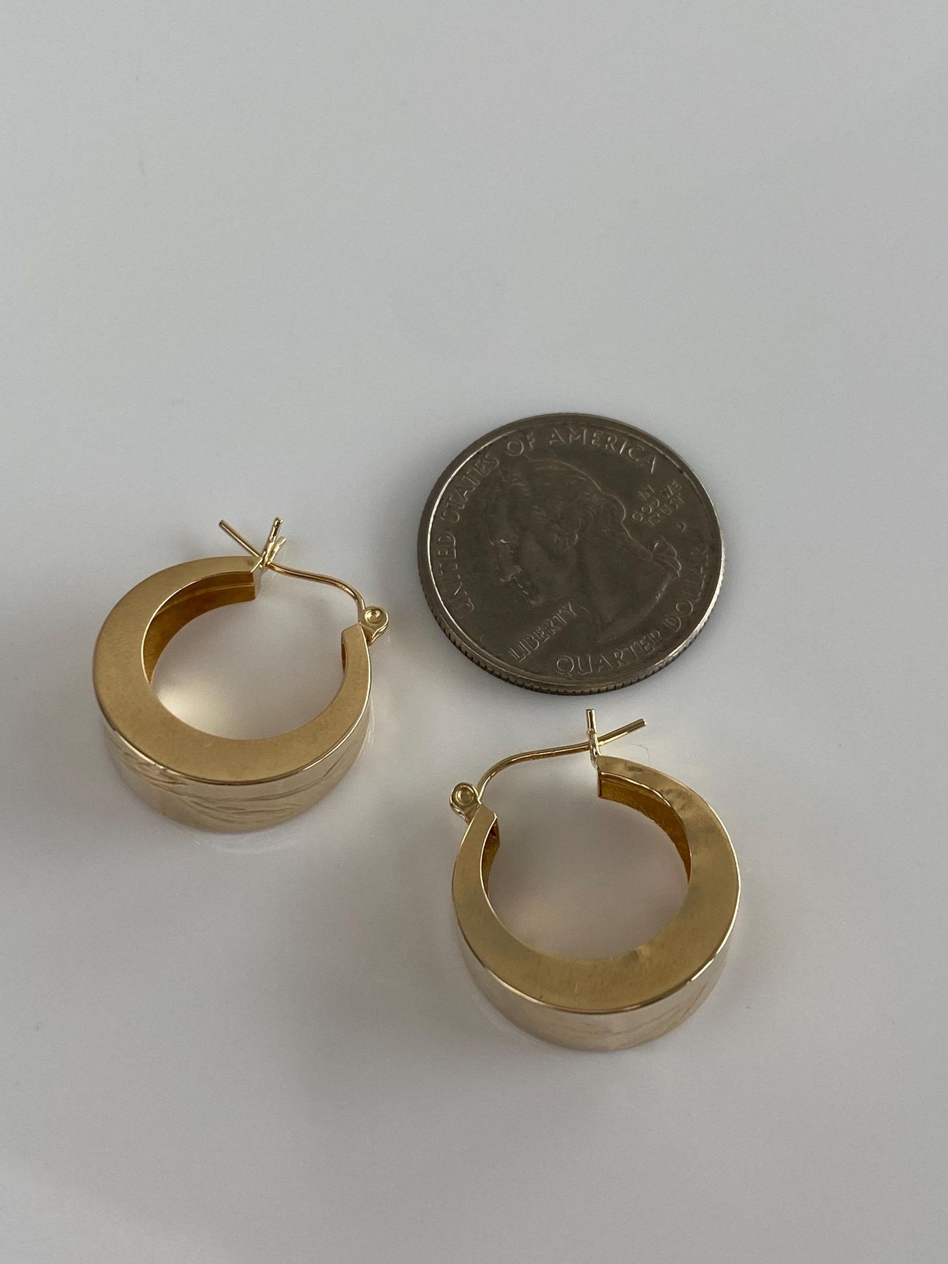 Vintage 14k Yellow Gold Engraved Leaves Tapered Hoop Earrings