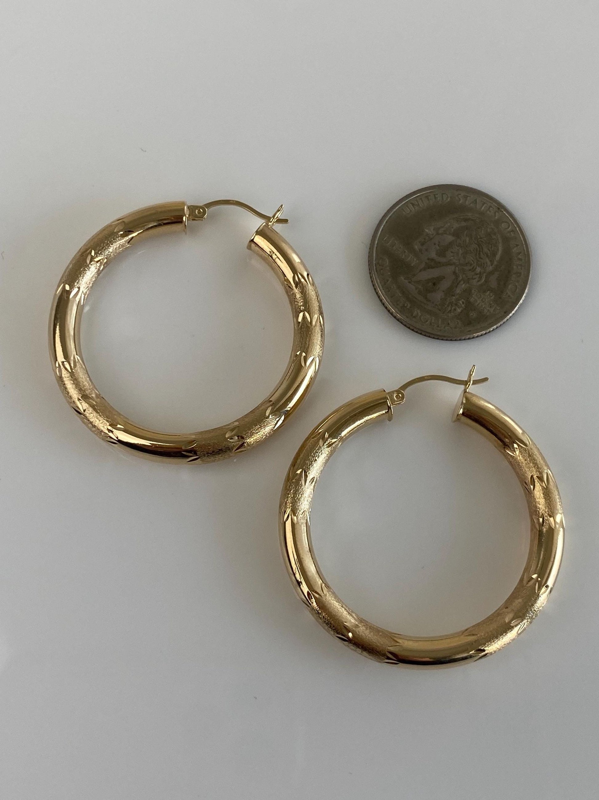 Vintage 14k Yellow Gold Large Diamond Cut Hoop Earrings
