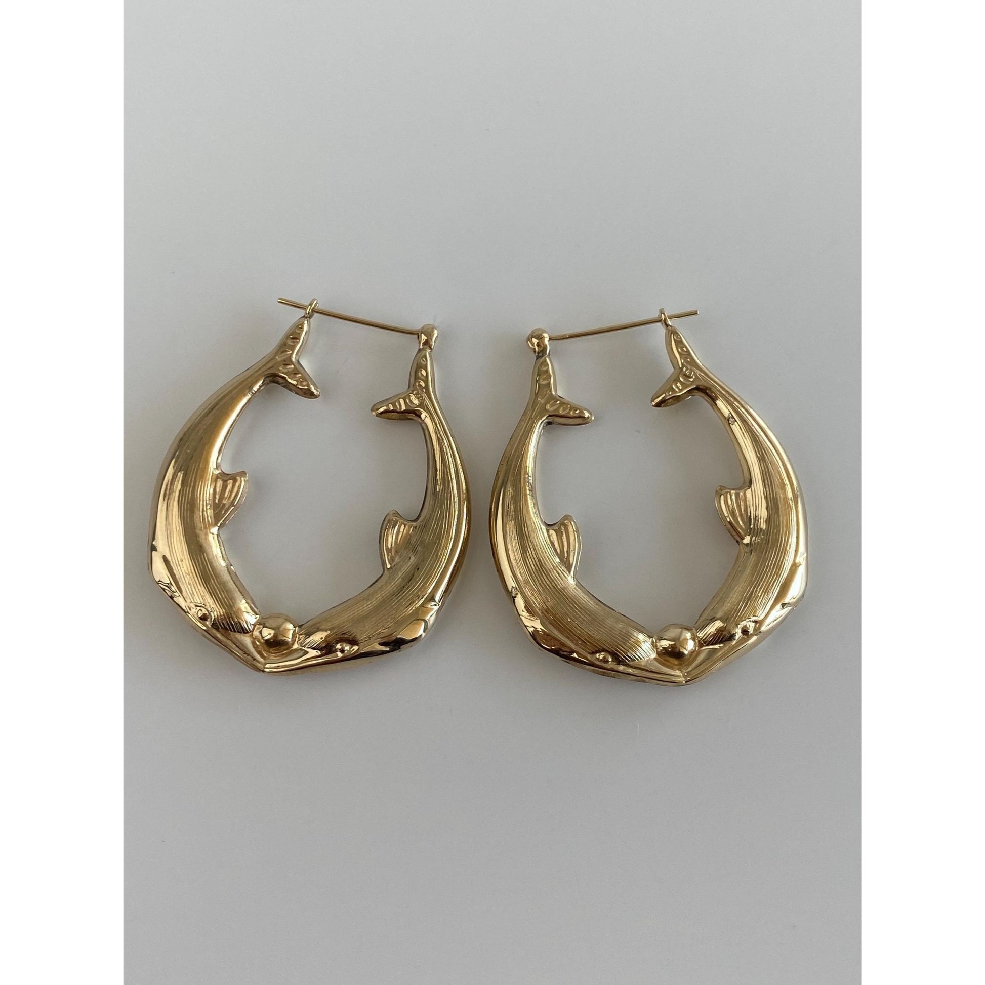 Vintage 14k Yellow Gold Large Dolphin Hoop Earrings