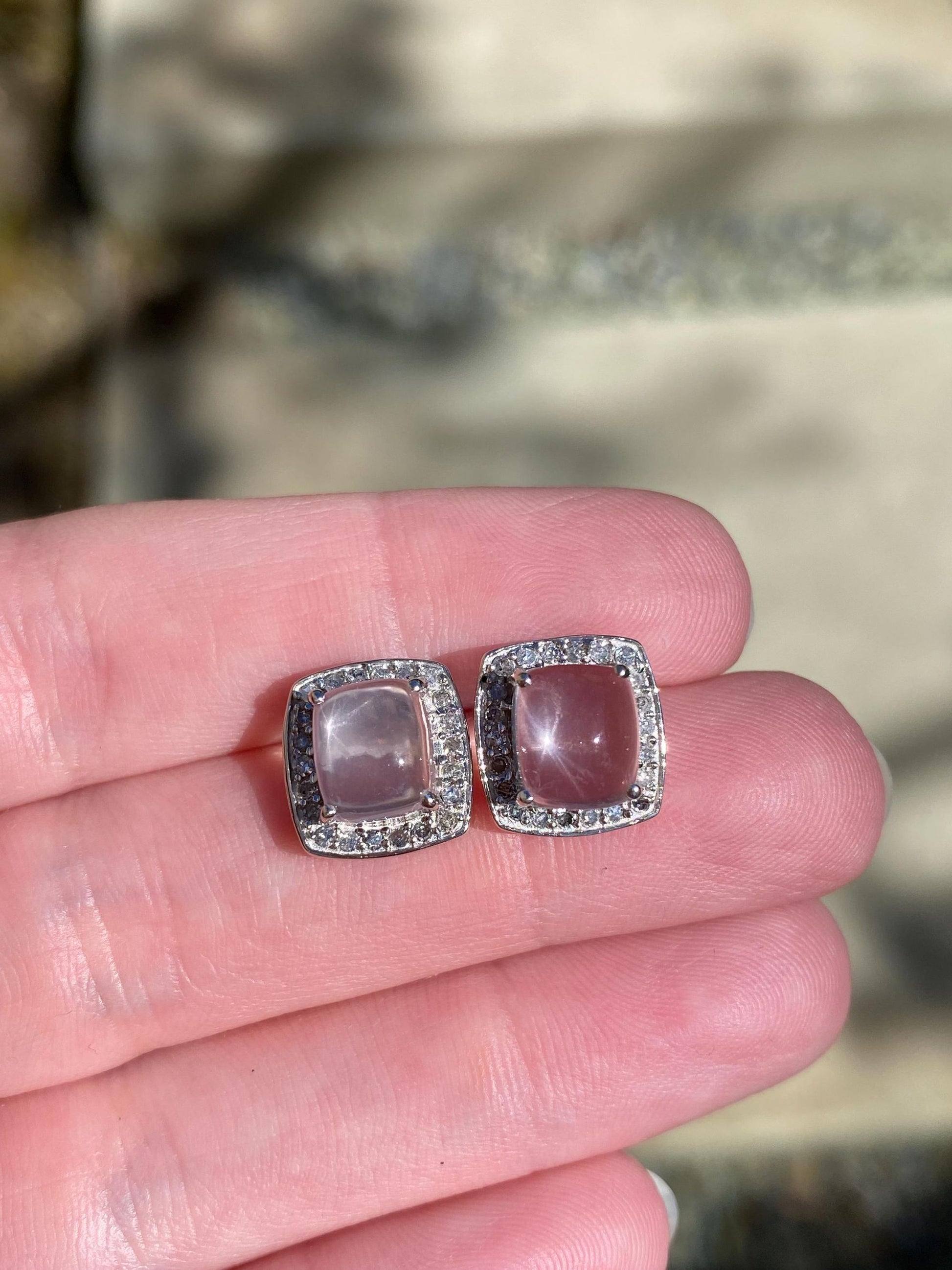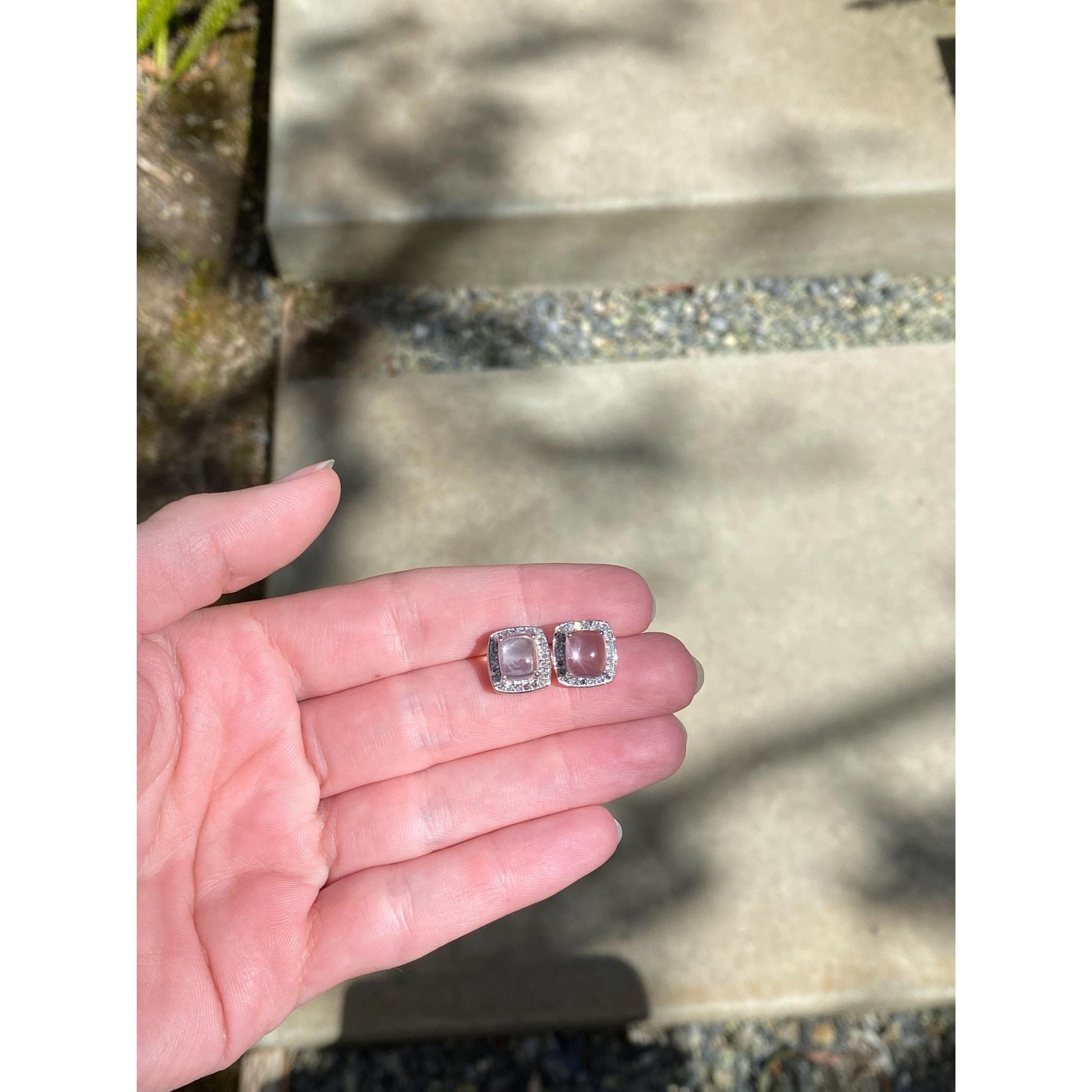 Vintage Solid 10k White Gold Rose Quartz Diamond Halo Stud Earrings