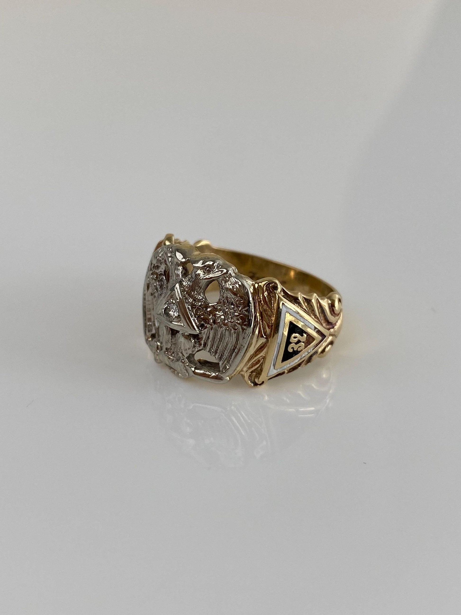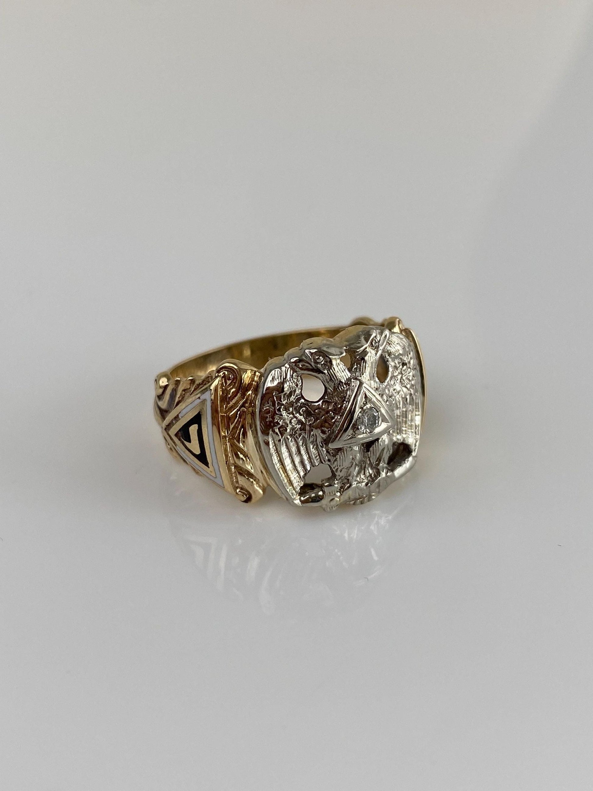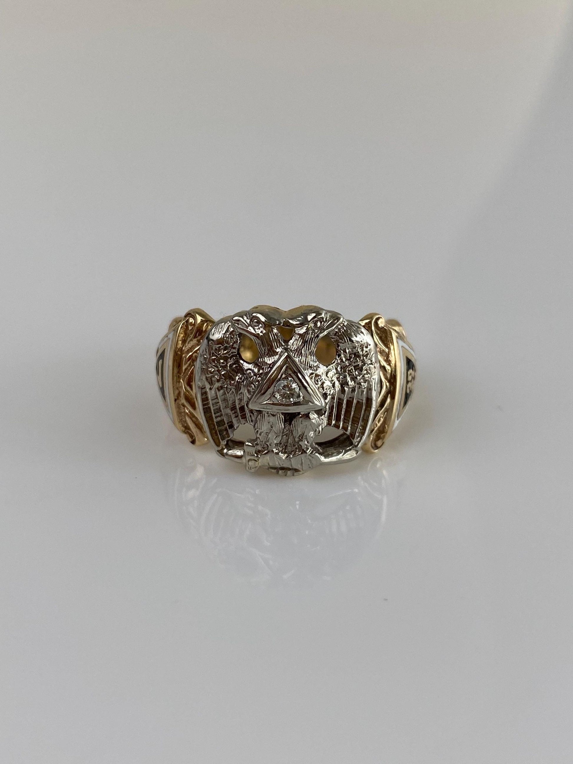 Vintage Solid 10k White & Yellow Gold Masion Diamond Enamel Double Eagle Ring Band - Size 9.25