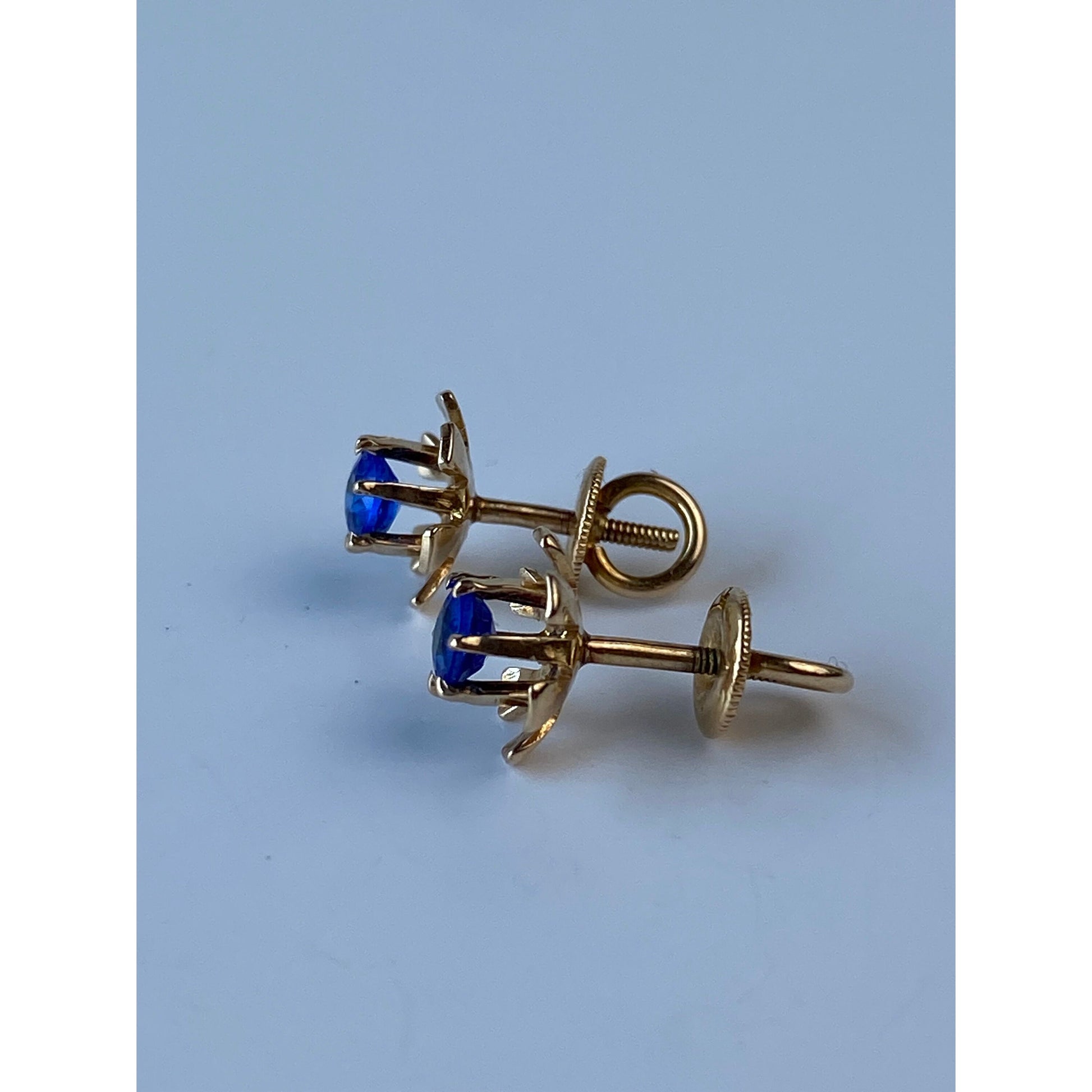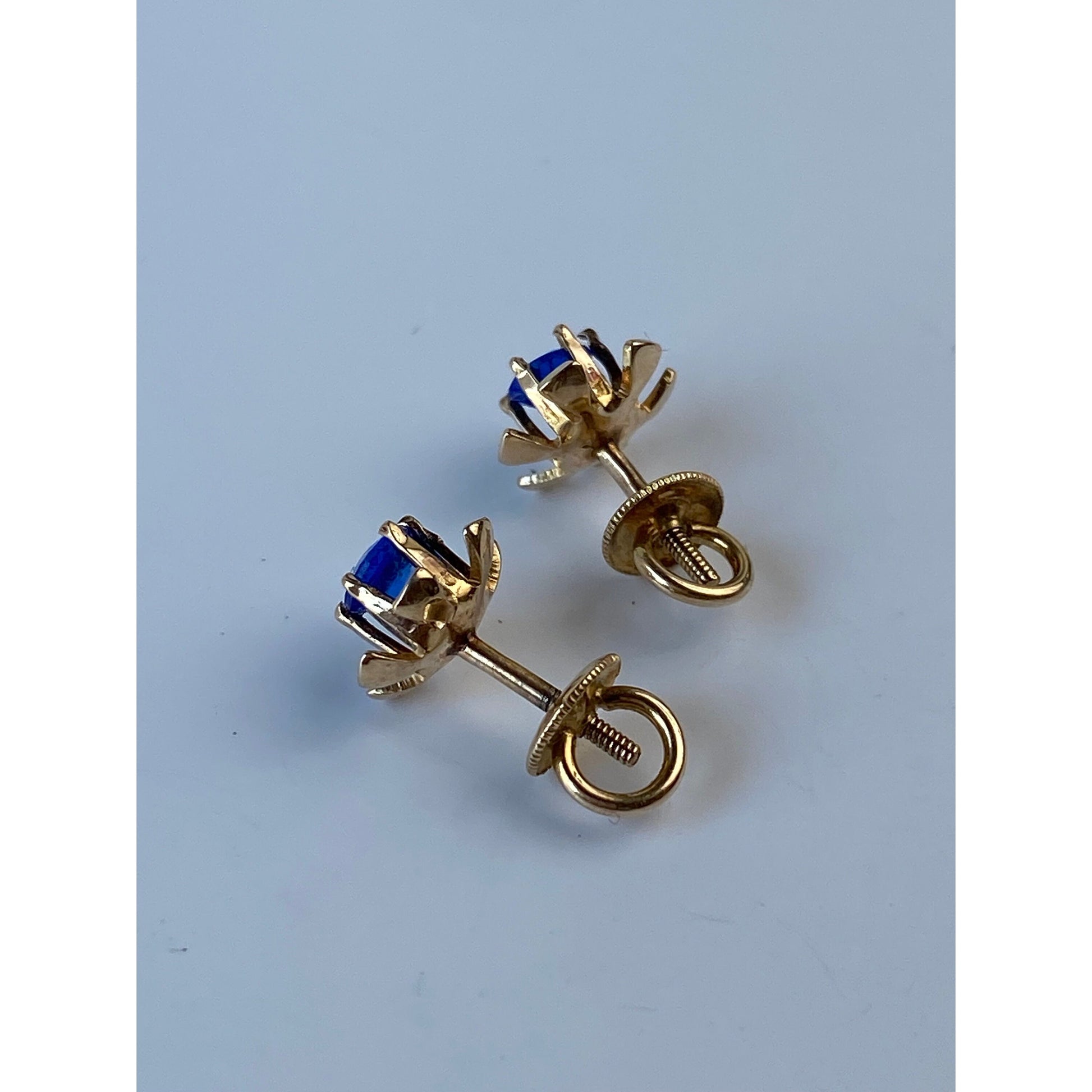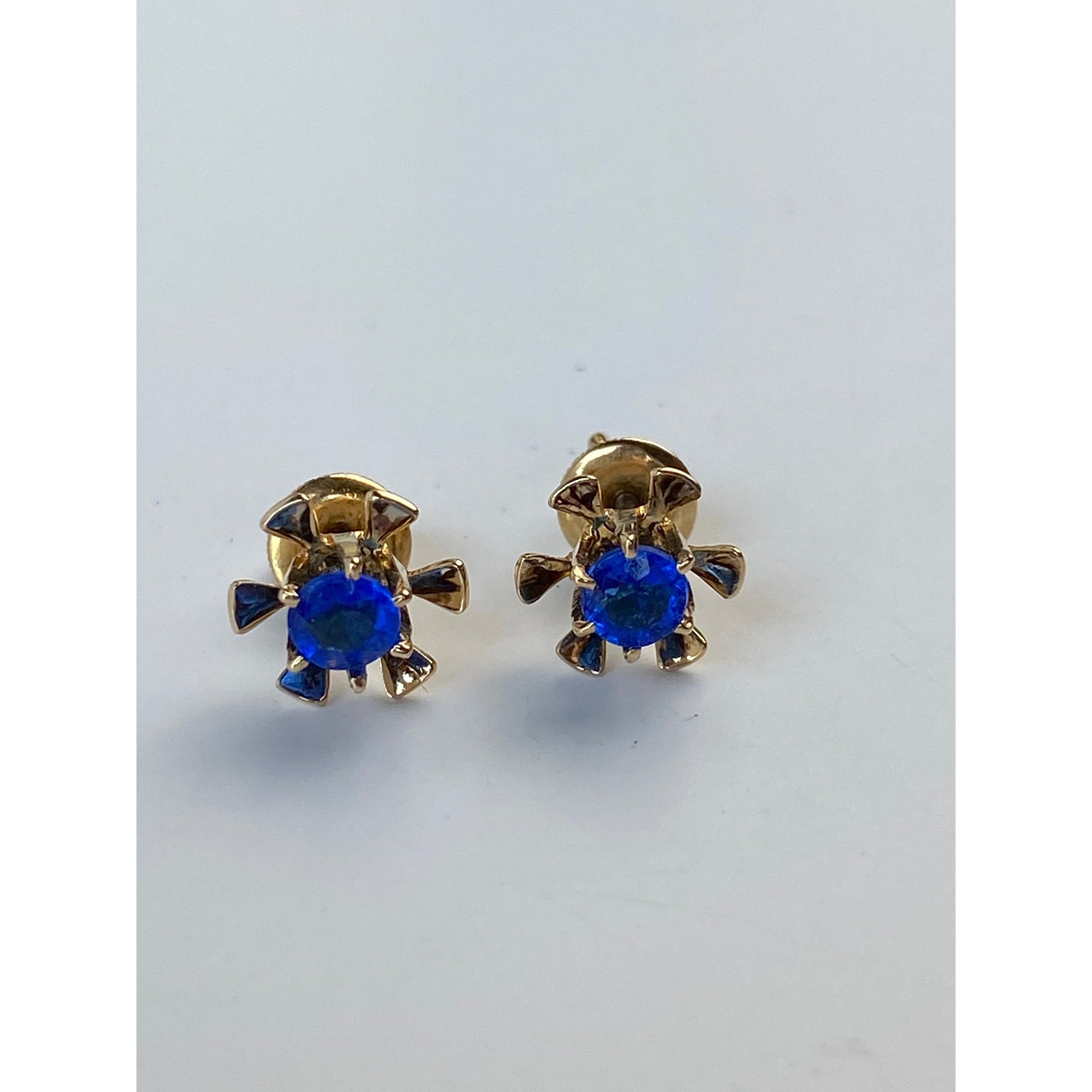 Vintage Solid 10k Yellow Gold Blue Cubic Zirconia Flower Screw Back Stud Earrings