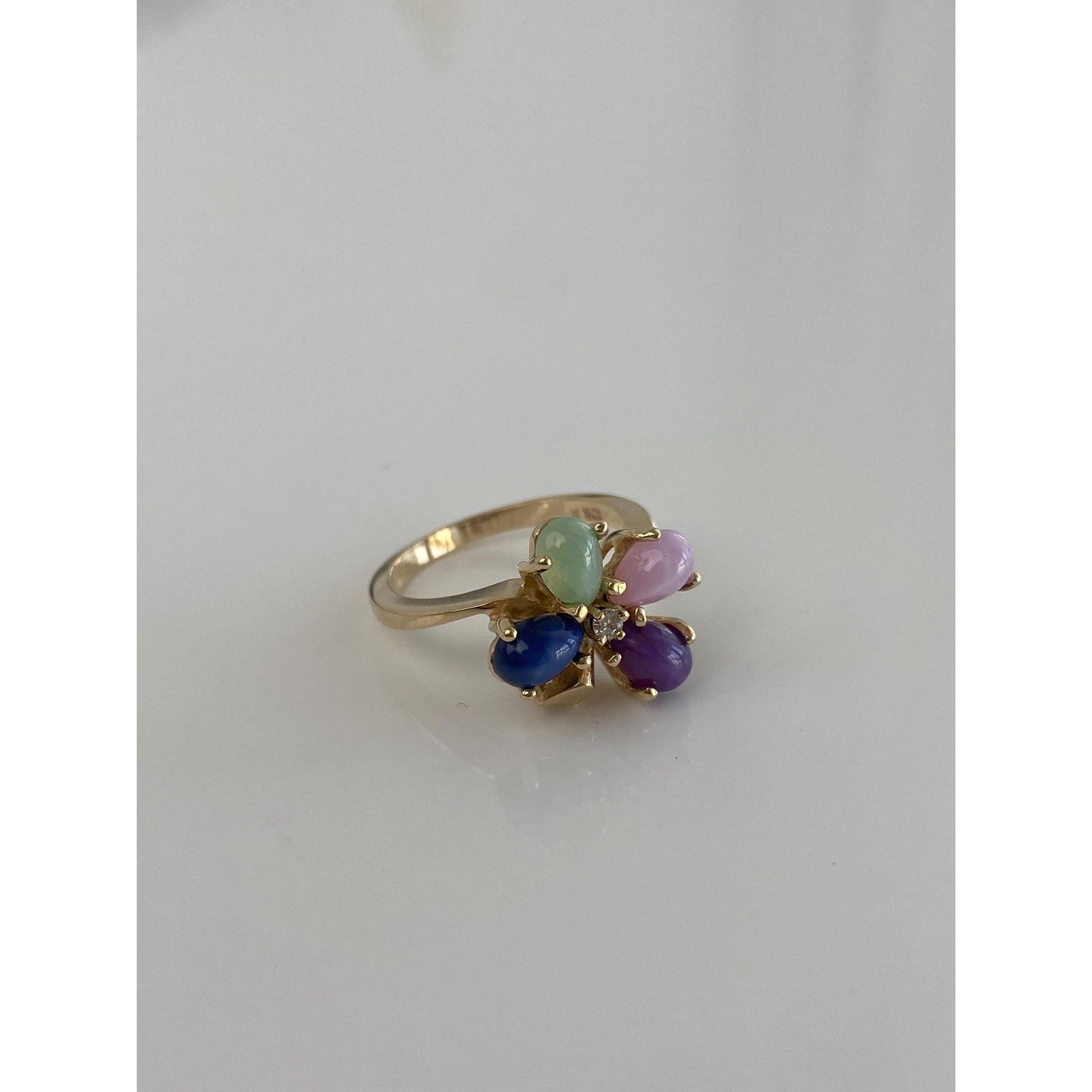 Vintage Solid 10k Yellow Gold Diamond Blue, Green & Pink Star Sapphire Clover Ring - Size 5.75