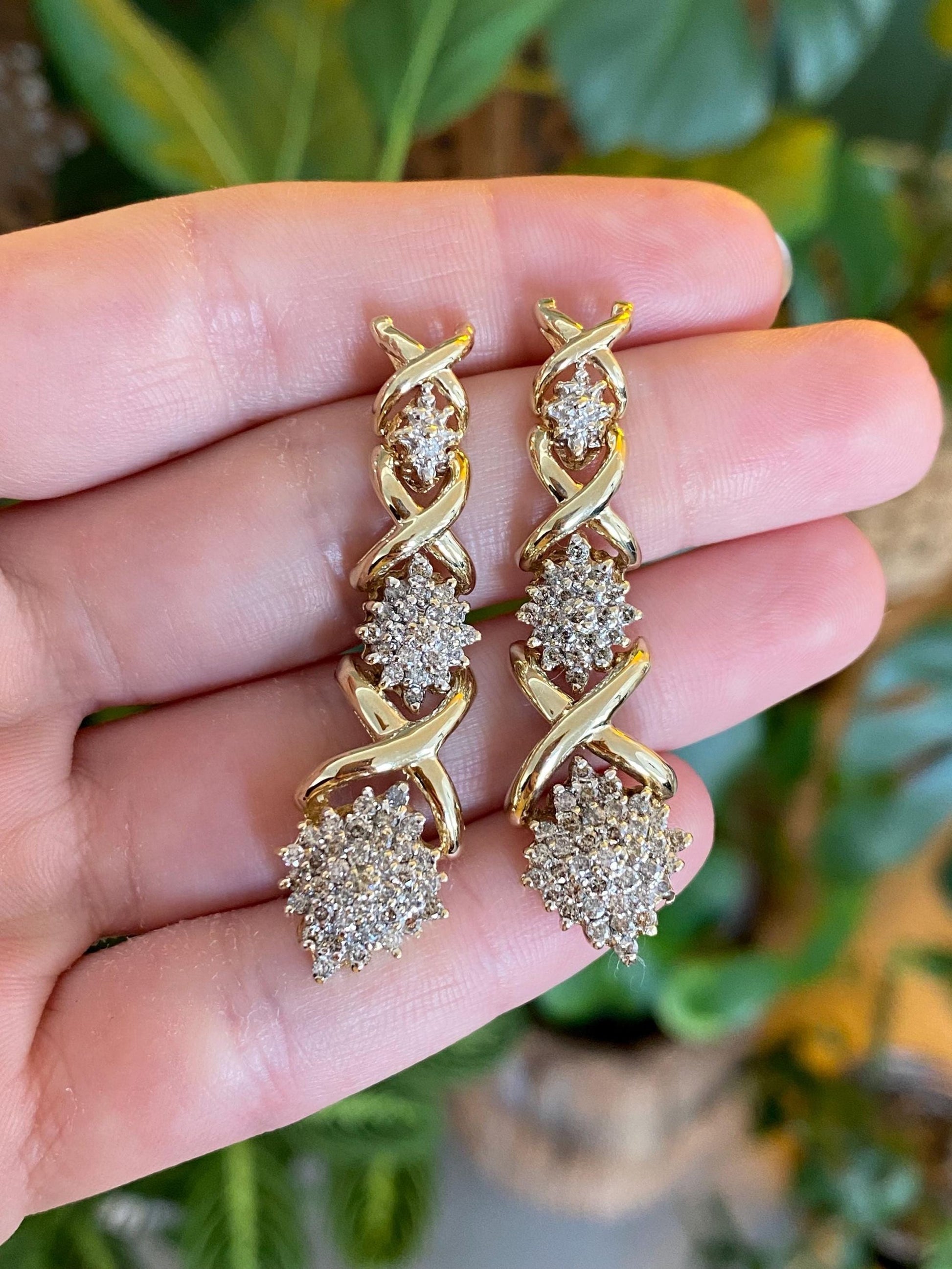 Vintage Solid 10k Yellow Gold Diamond Cluster X Link Drop Earrings