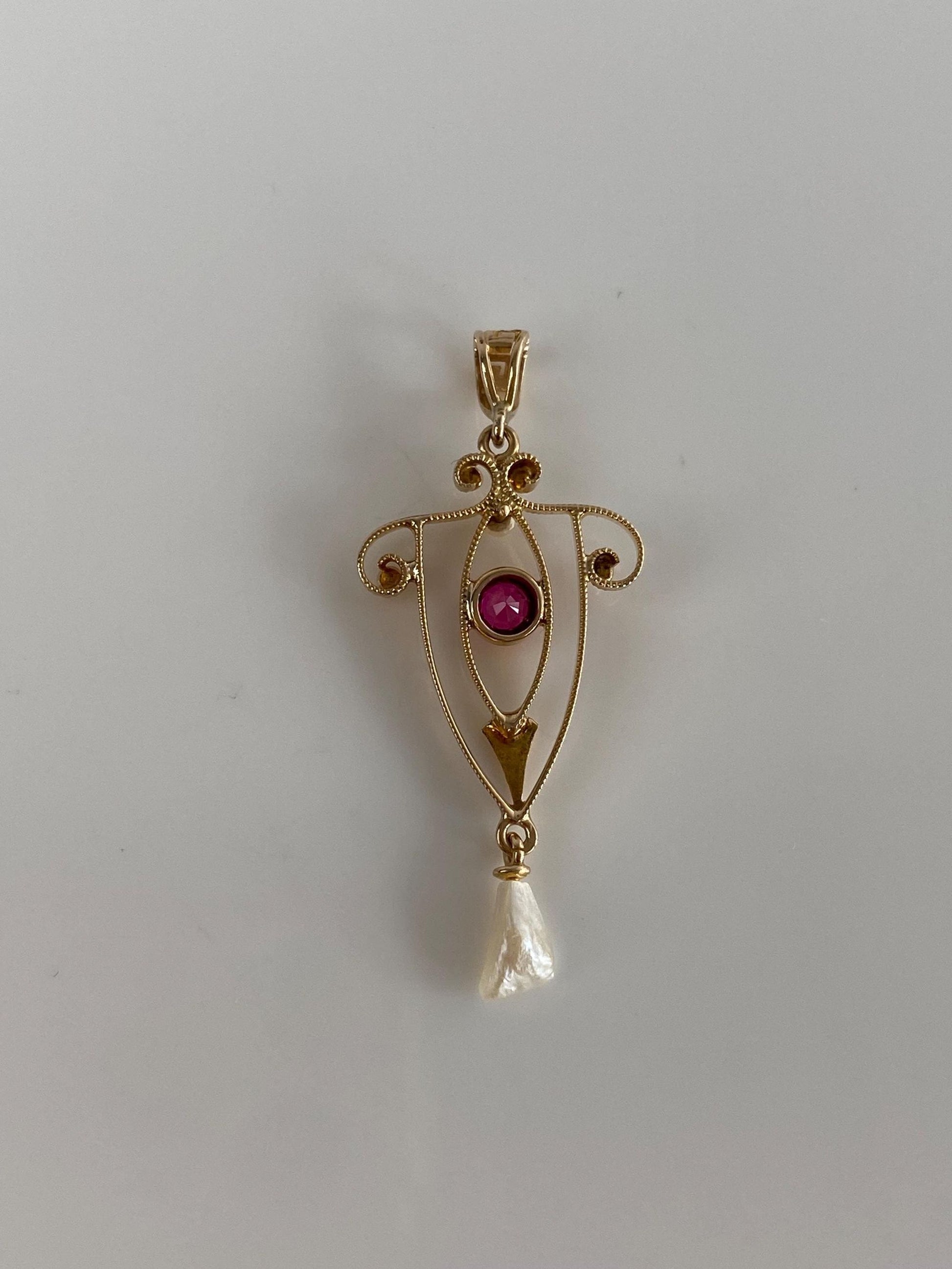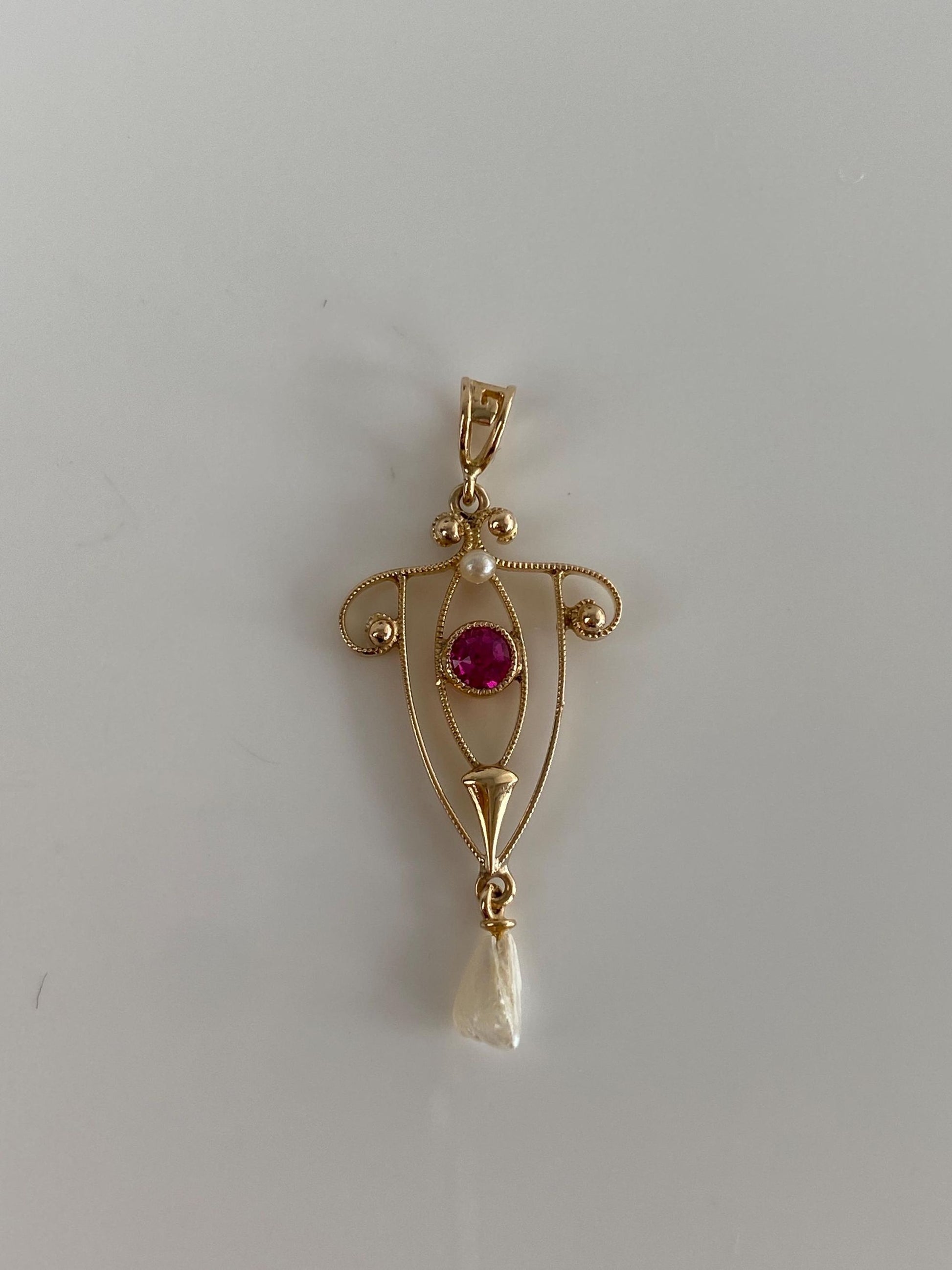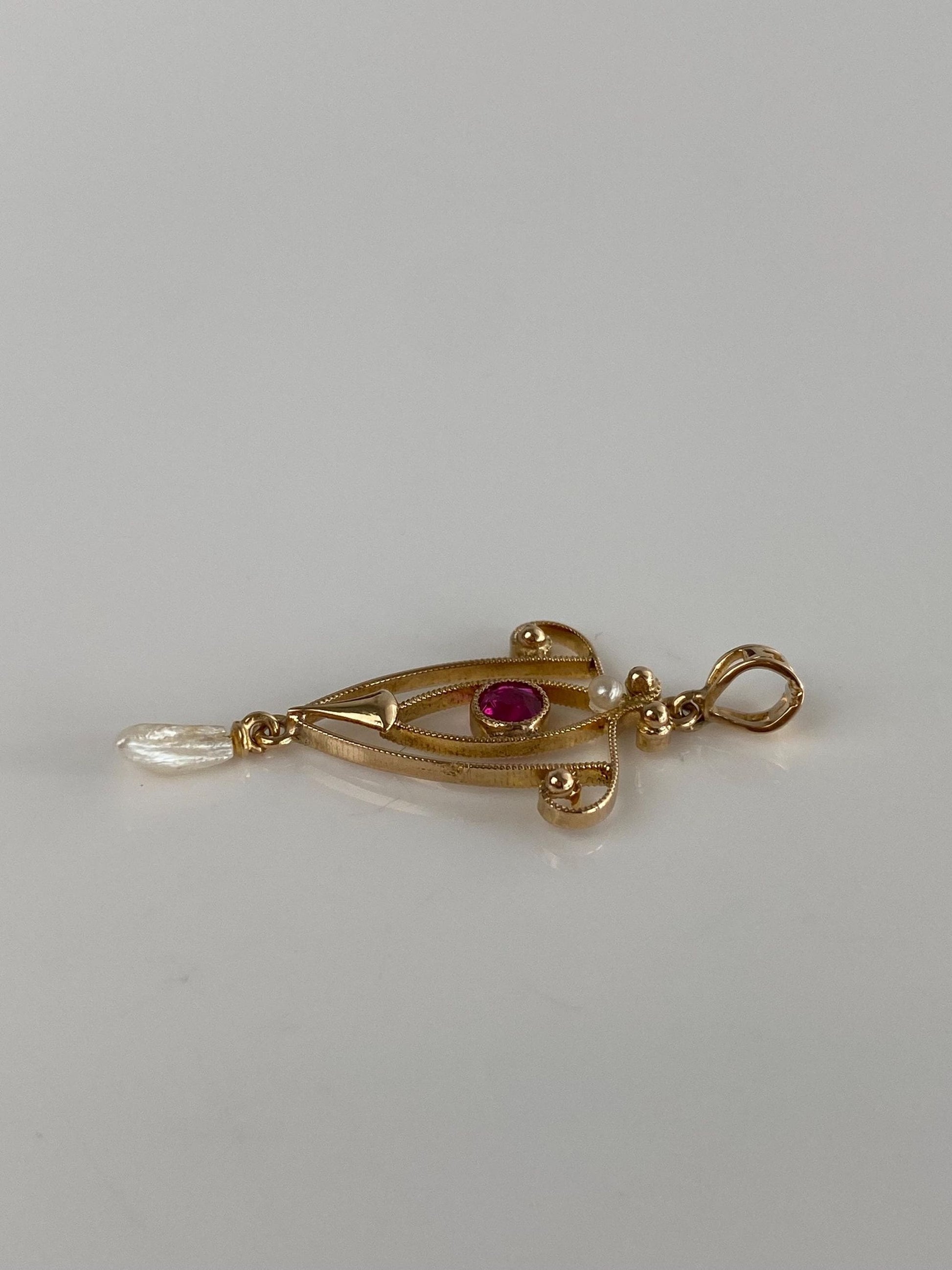 Vintage Solid 10k Yellow Gold Pink Sapphire Pearl Dangle Charm
