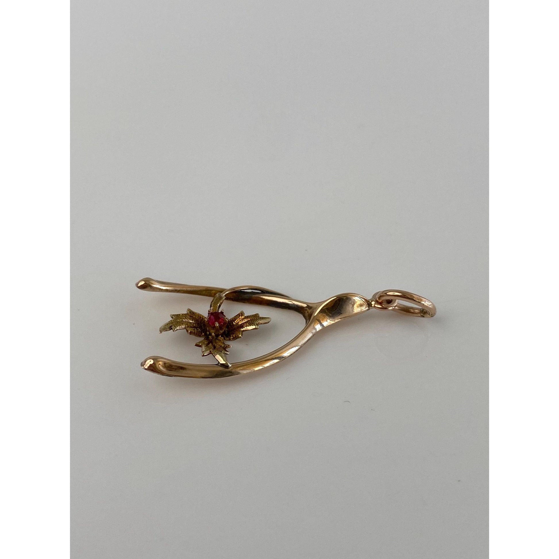 Vintage Solid 10k Yellow Gold Red Cubic Zirconia Maple Leaf Wishbone Charm