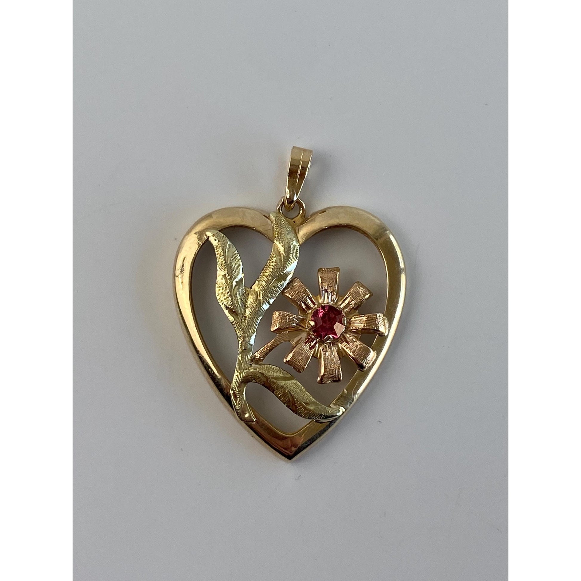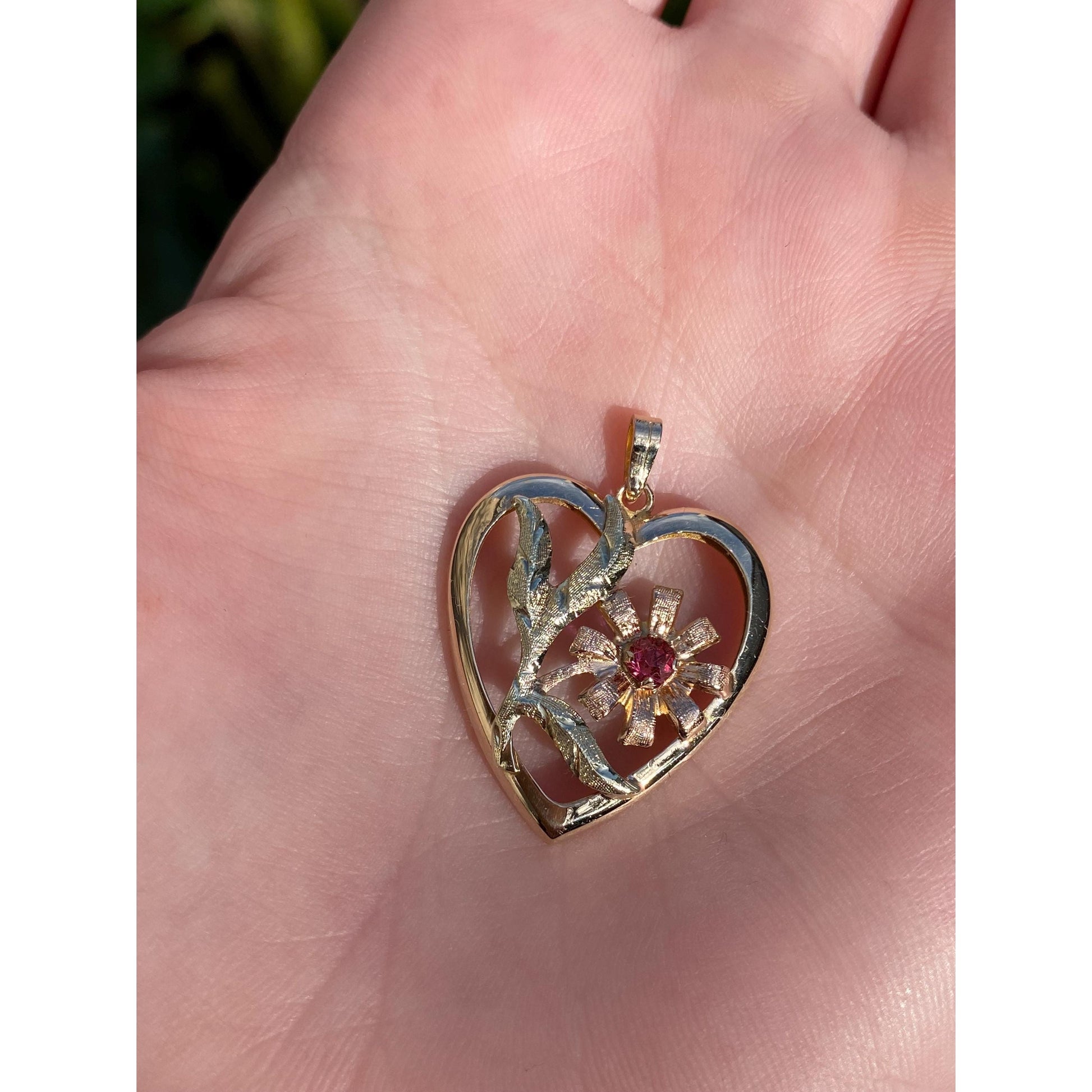 Vintage Solid 14k Multi Tone Gold Pink Cubic Zirconia Flower Heart Charm