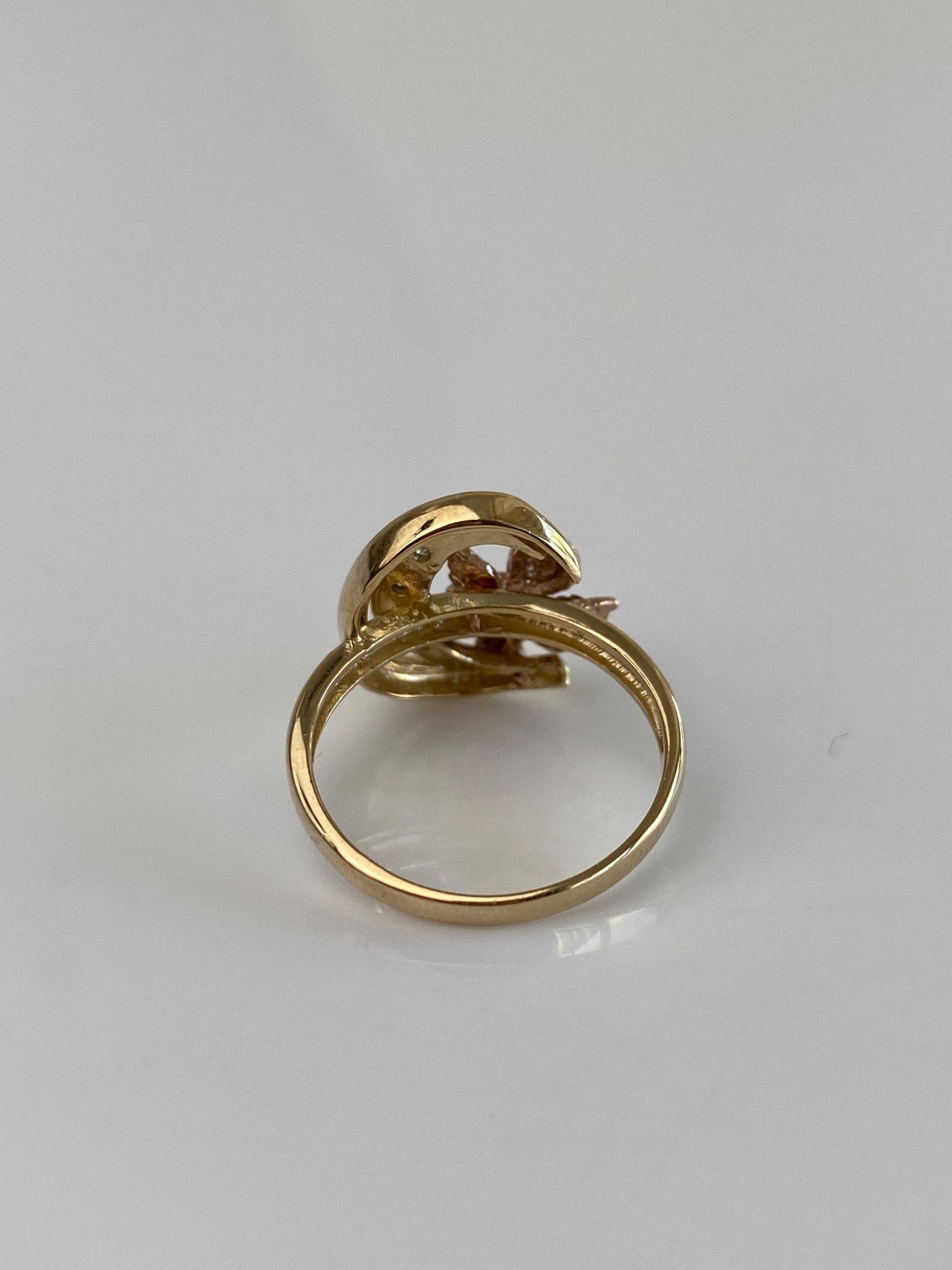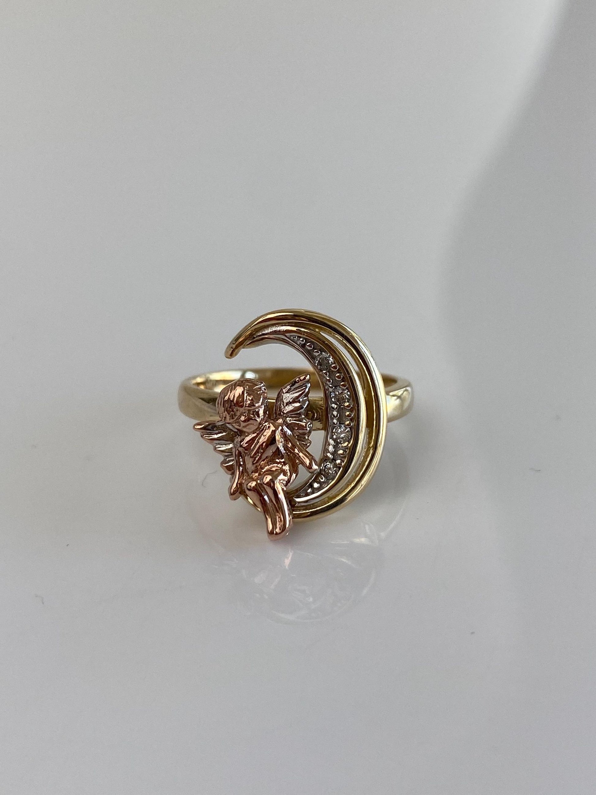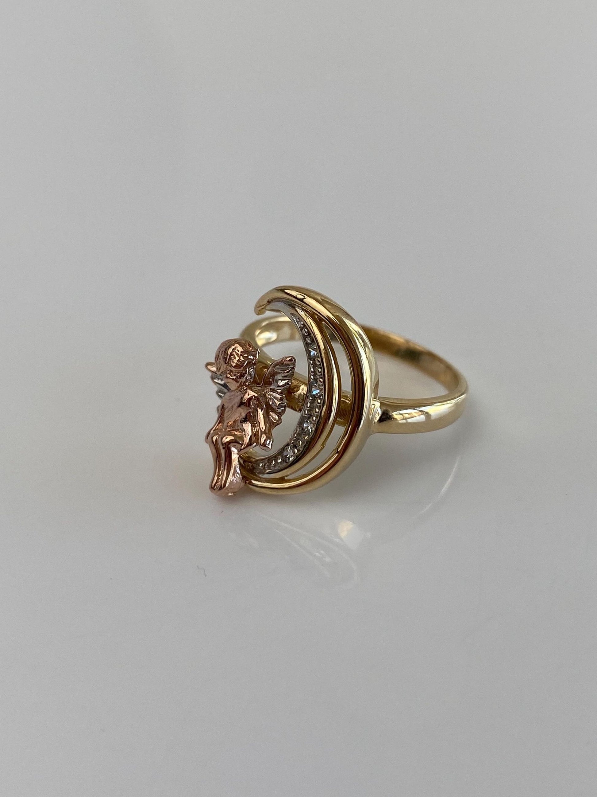 Vintage Solid 14k Tri Tone Gold Clear Cubic Zirconia Angel Crescent Moon Ring - Size 7