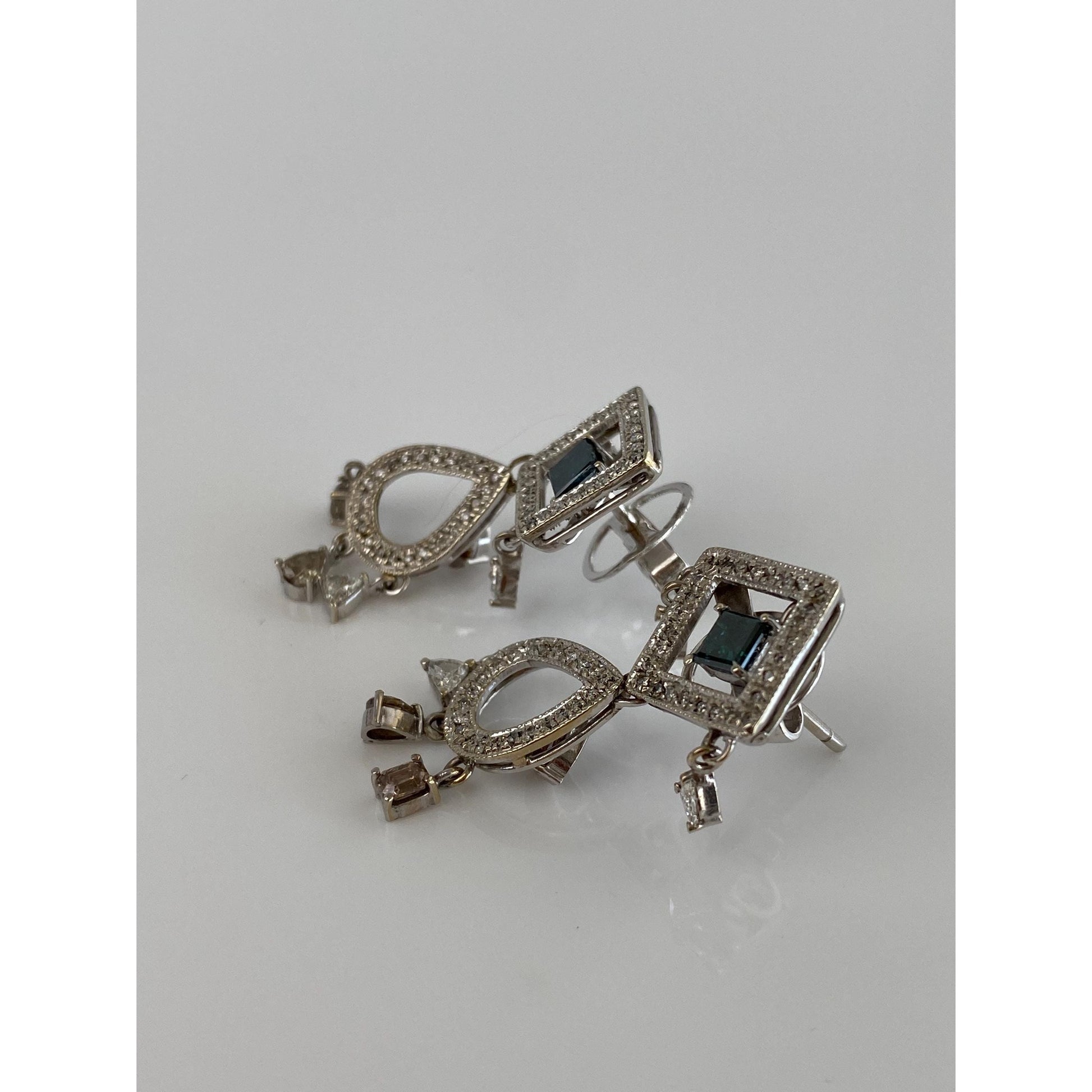 Vintage Solid 14k White Gold Blue Brown & Clear Diamond Drop Dangle Earrings