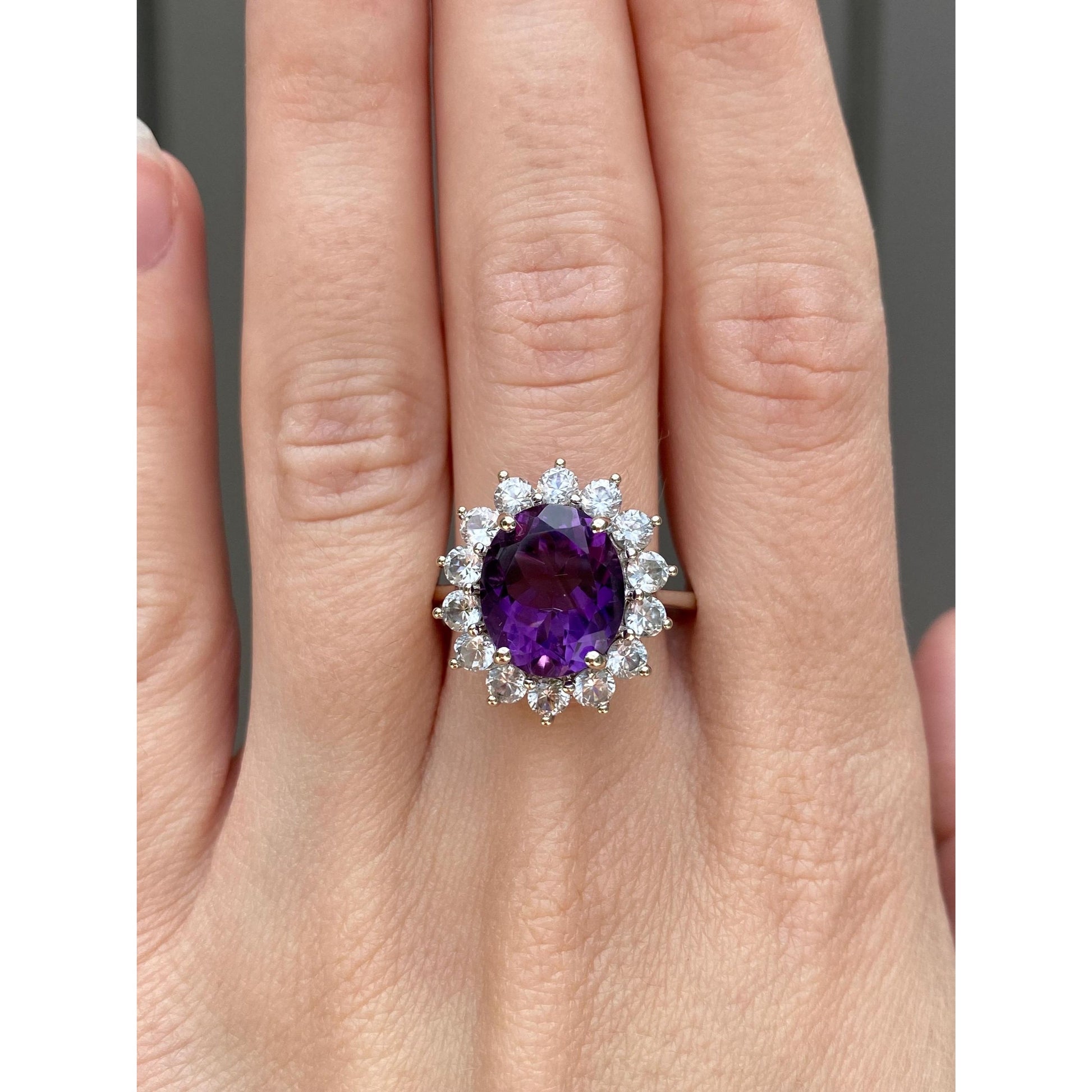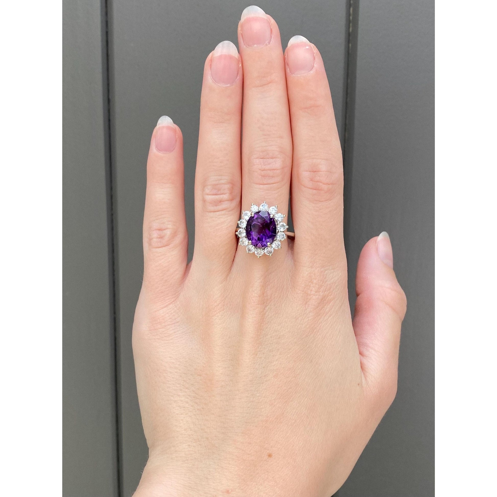 Vintage Solid 14k White Gold Clear Quartz Halo Amethyst Ring - Size 10