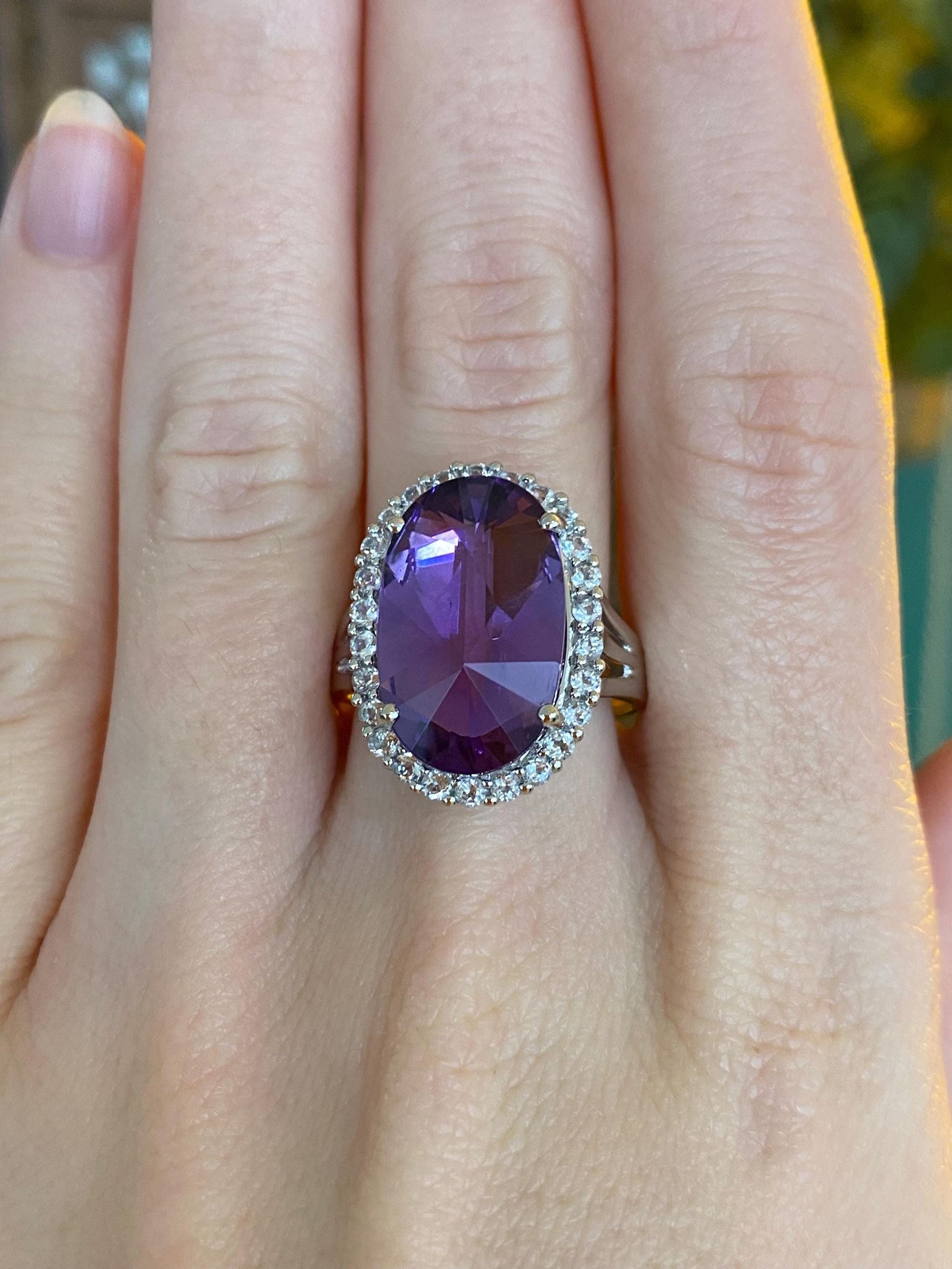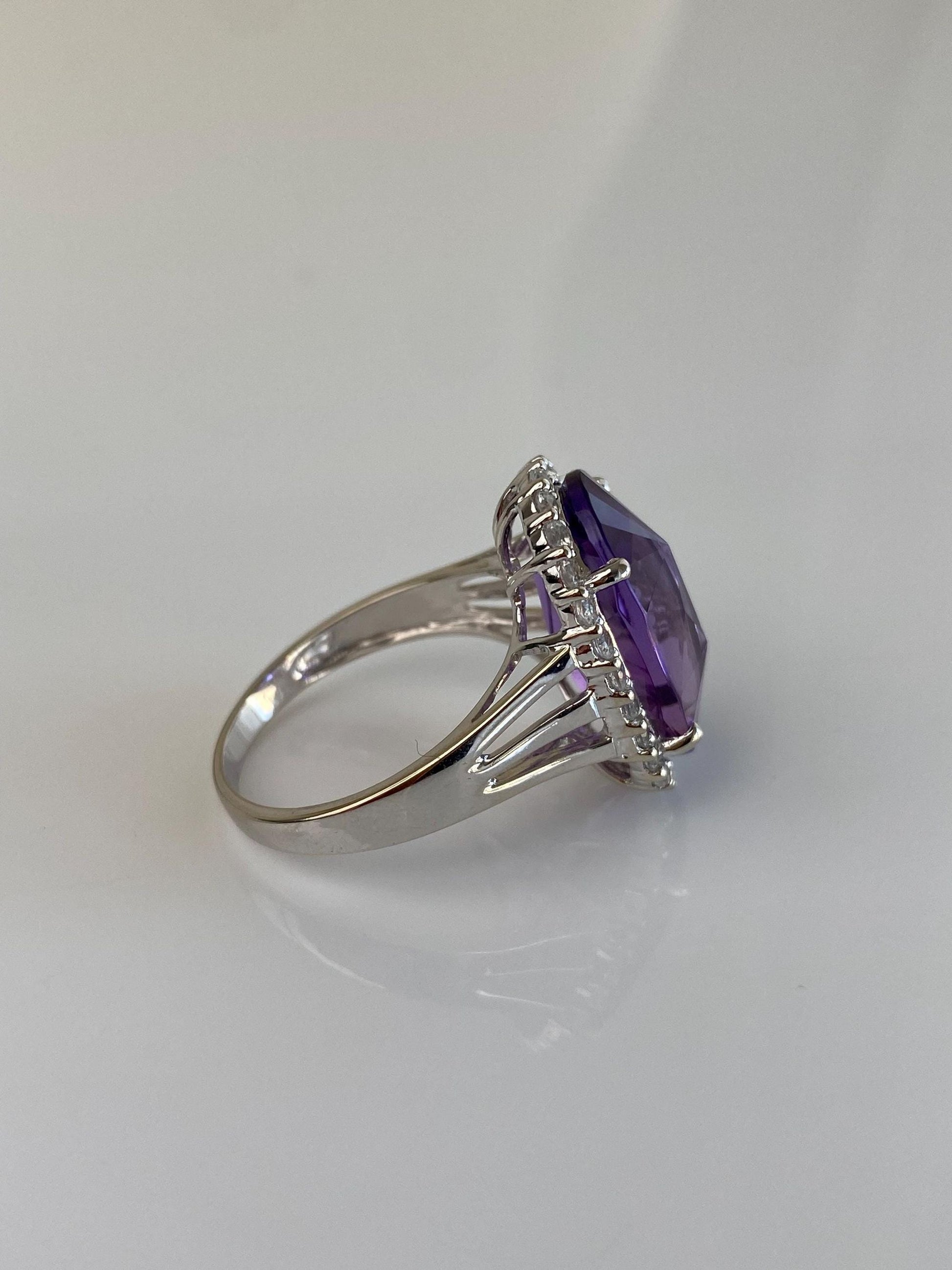 Vintage Solid 14k White Gold Clear Spinel Halo Amethyst Ring - Size 9