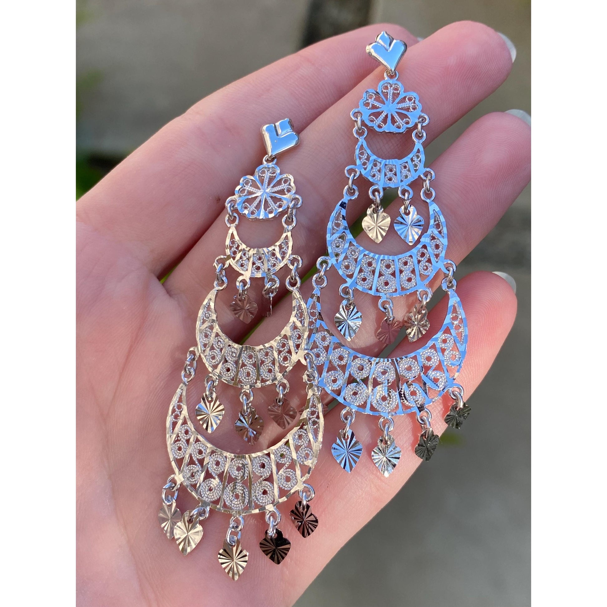 Vintage Solid 14k White Gold Diamond Cut Filigree Heart Chandelier Stud Earrings