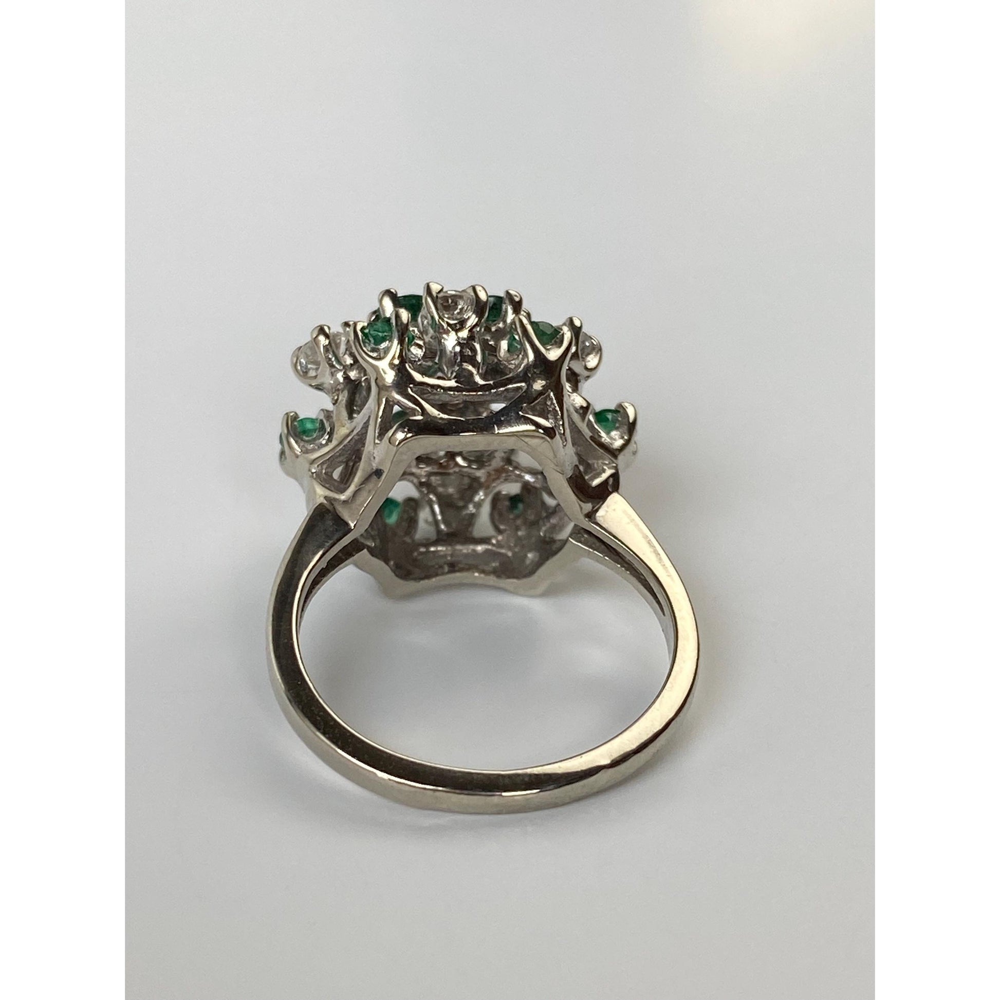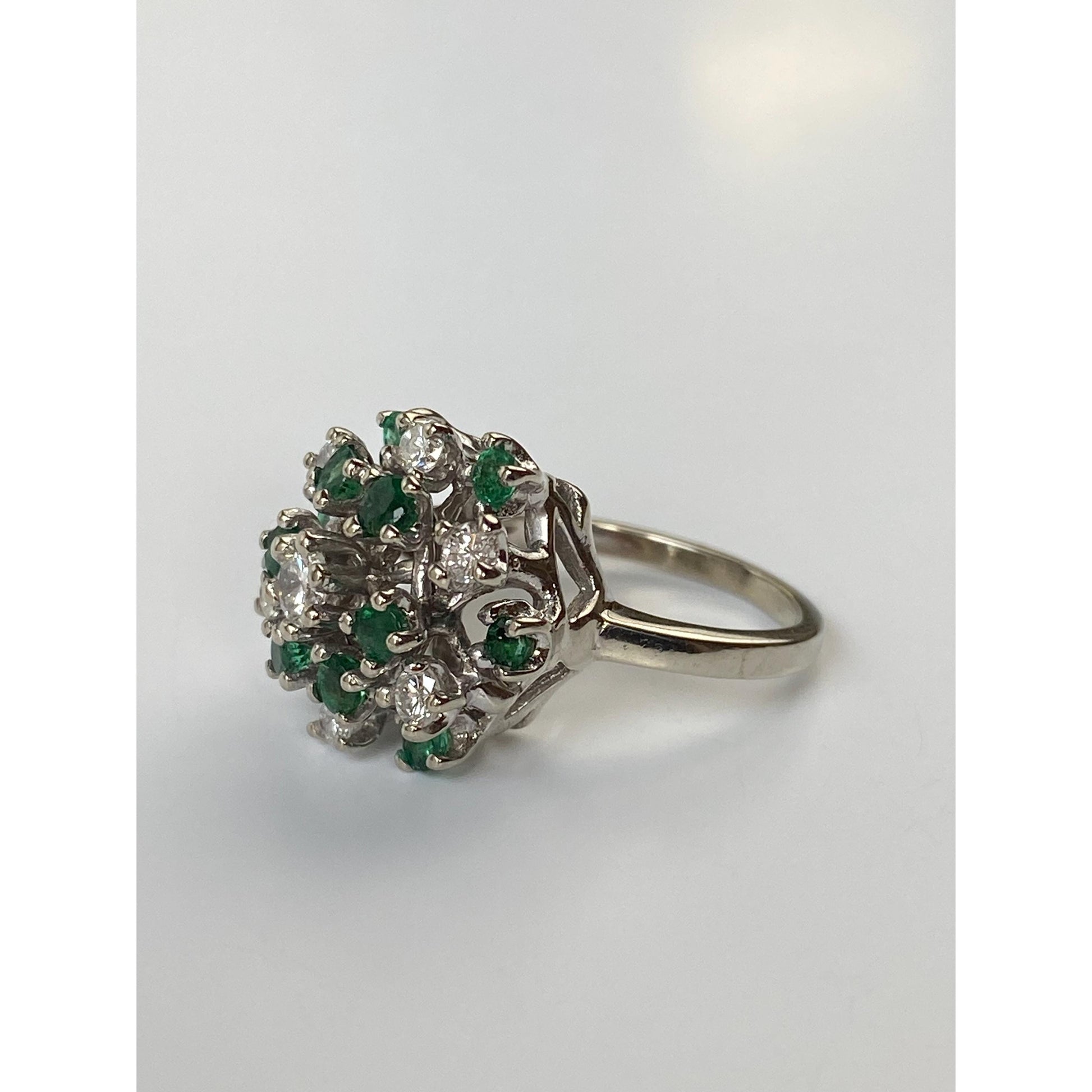 Vintage Solid 14k White Gold Diamond Emerald Cluster Cocktail Ring - Size 4